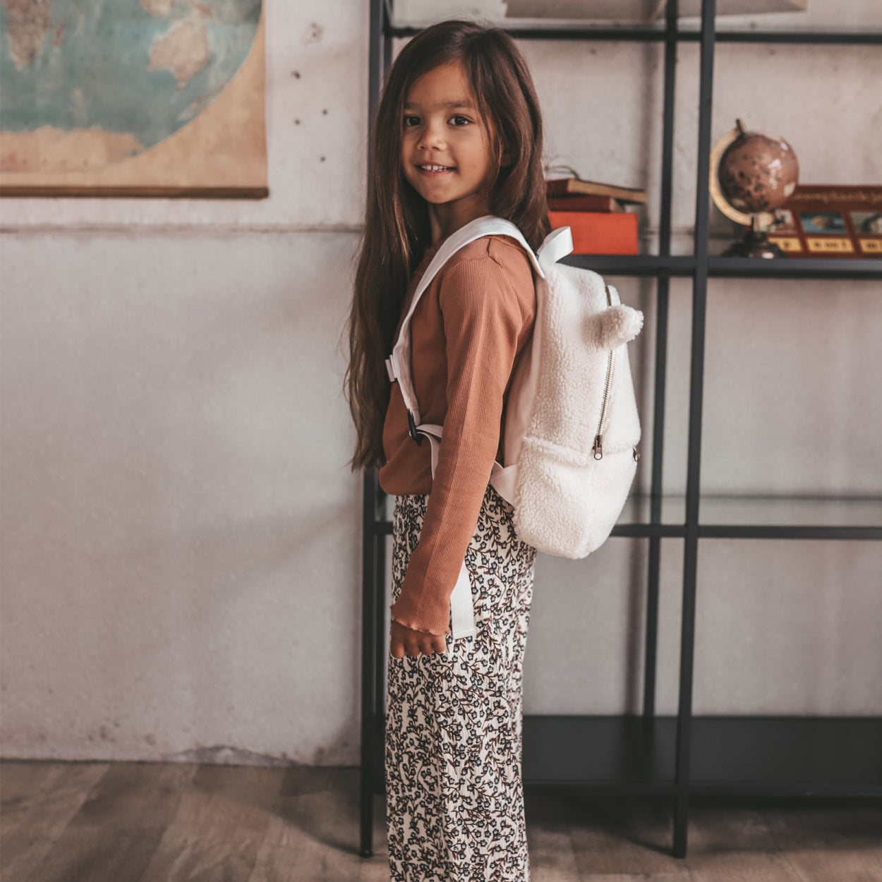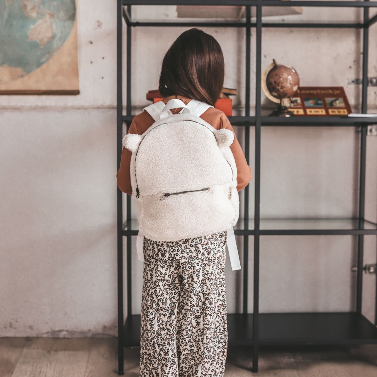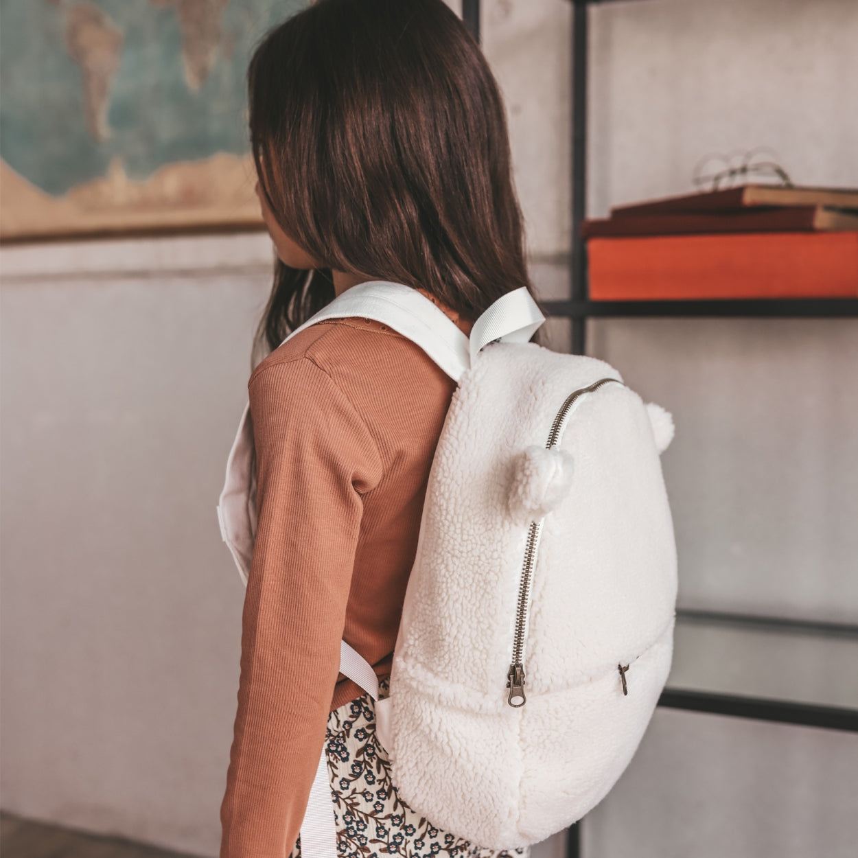 This Teddy children's backpack is wonderfully soft and features cute bear ears. The backpack has one large compartment which closes with a zipper and on the front another small pocket with zipper. The shoulder straps of the backpack are adjustable. The backpack has room enough for a school cup, lunch box and fruit bowl. Available in the colors Taupe and Off-White.