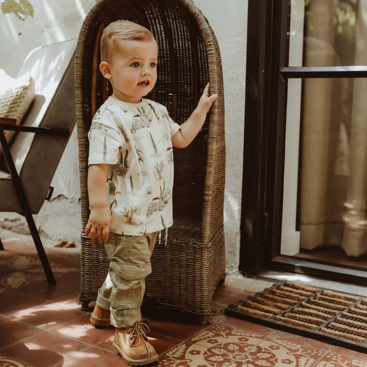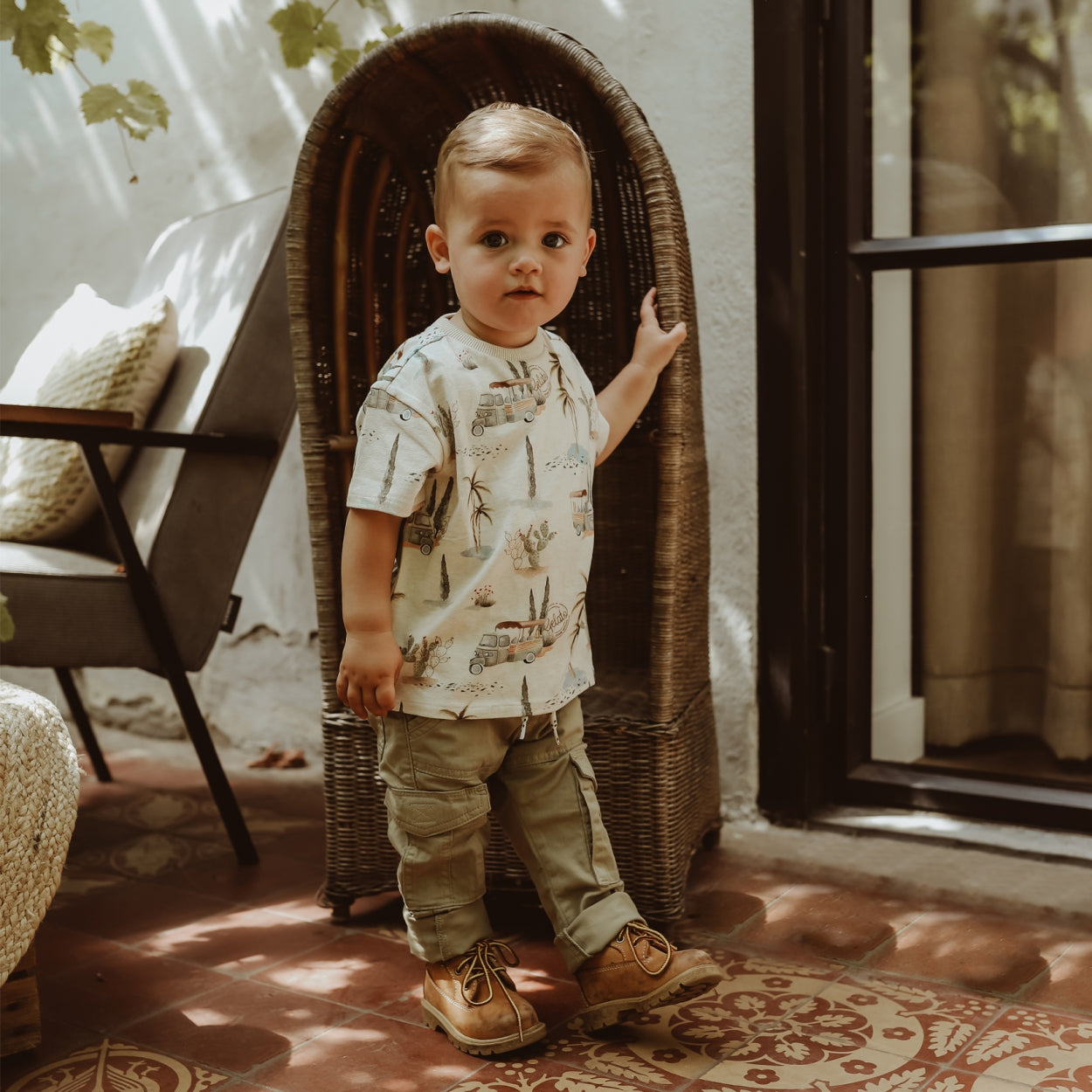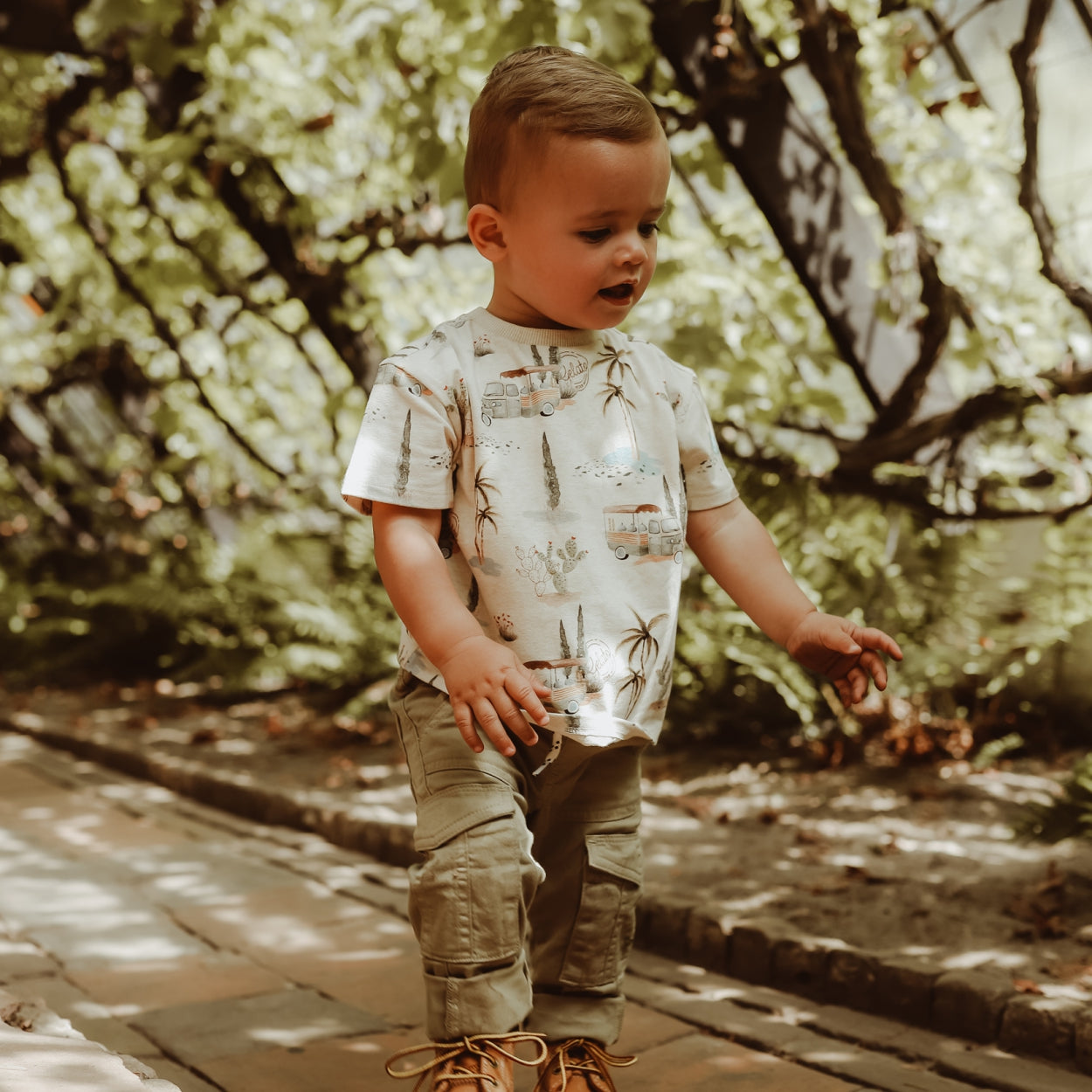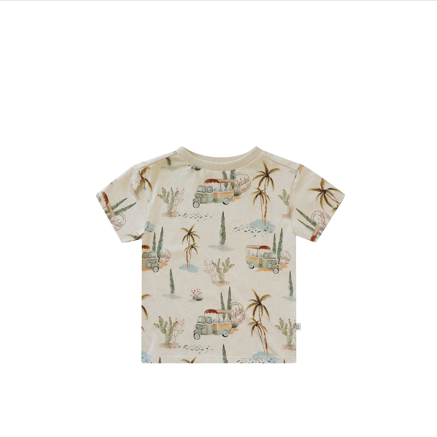 Dit t-shirt heeft een zomerse print met illustraties van palmbomen en Italiaanse ijskarretjes. Het t-shirt heeft korte mouwen en een ronde hals.