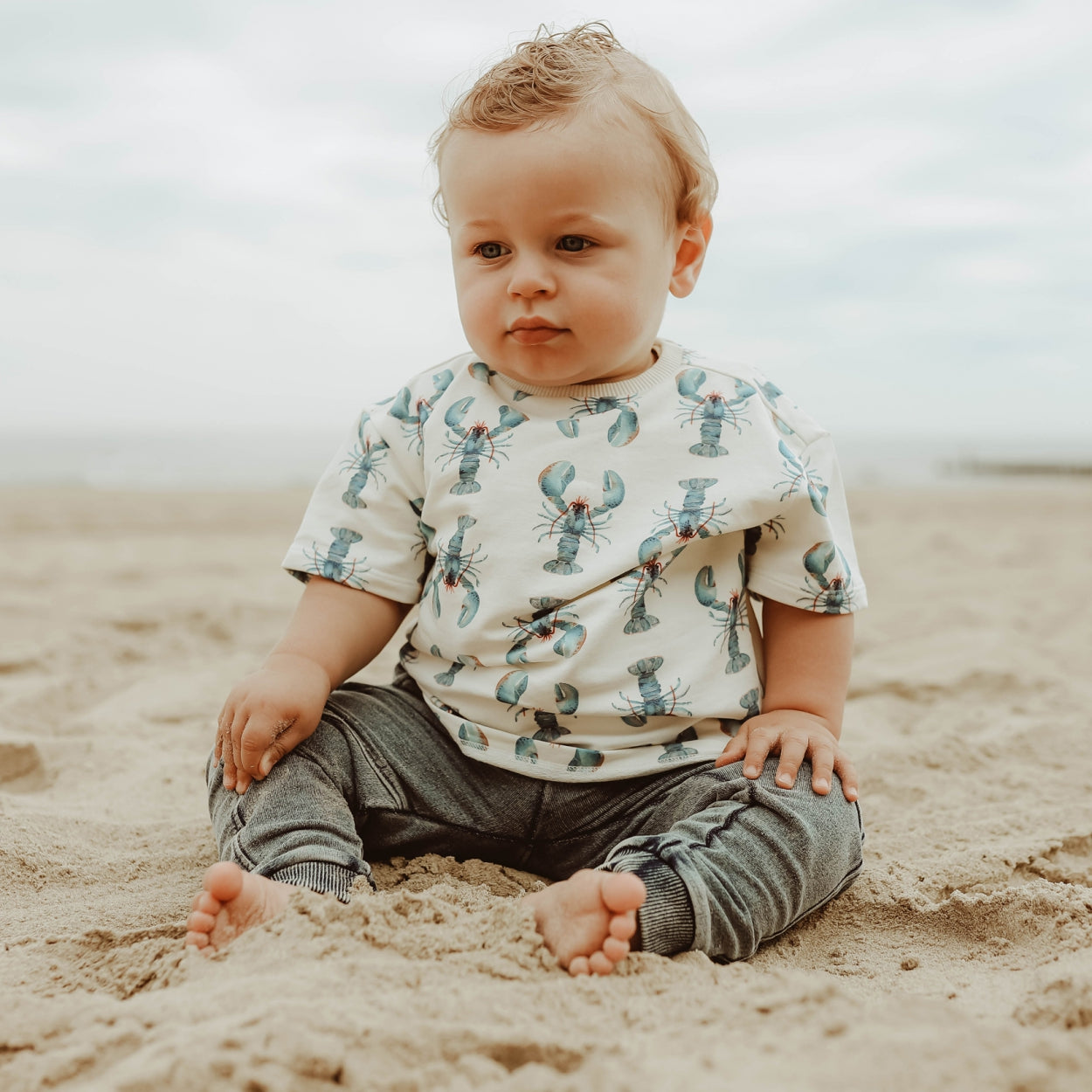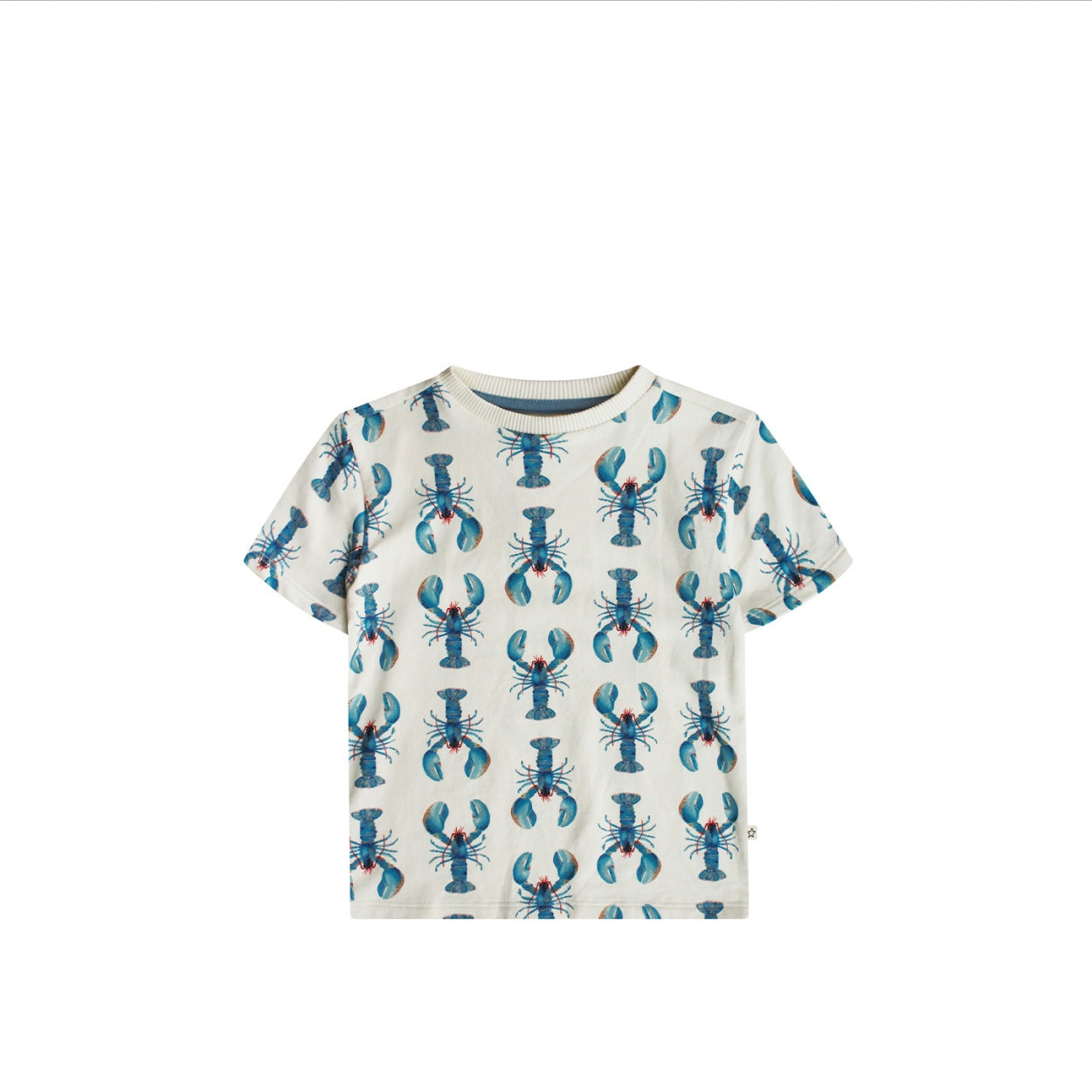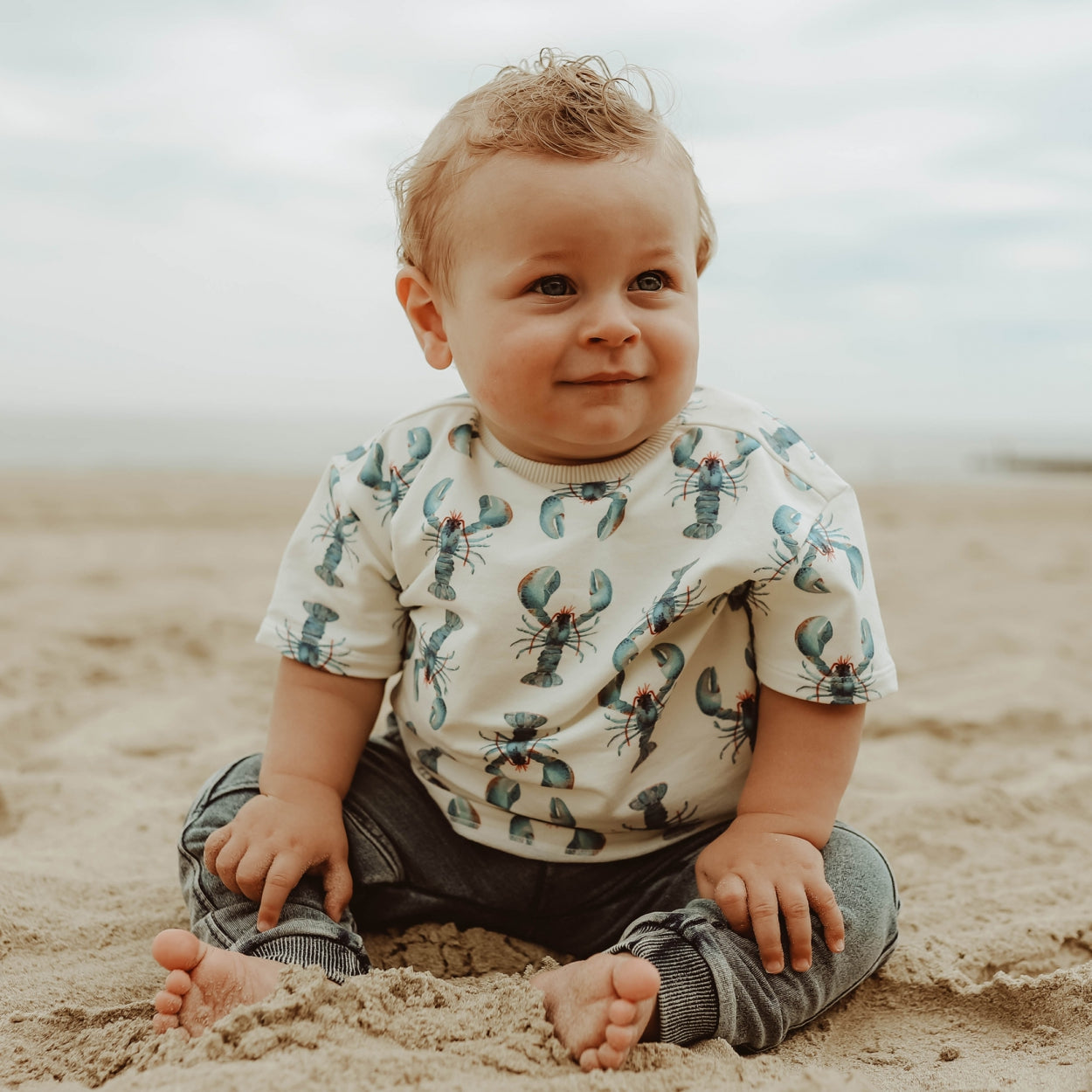 Een speels t-shirt voor de stoere jongens. Het shirt heeft een kleurrijke print met blauwe kreeften. Het model heeft korte mouwen en een ronde hals. Maak de outfit helemaal af met onze knitted denim items uit deze collectie.