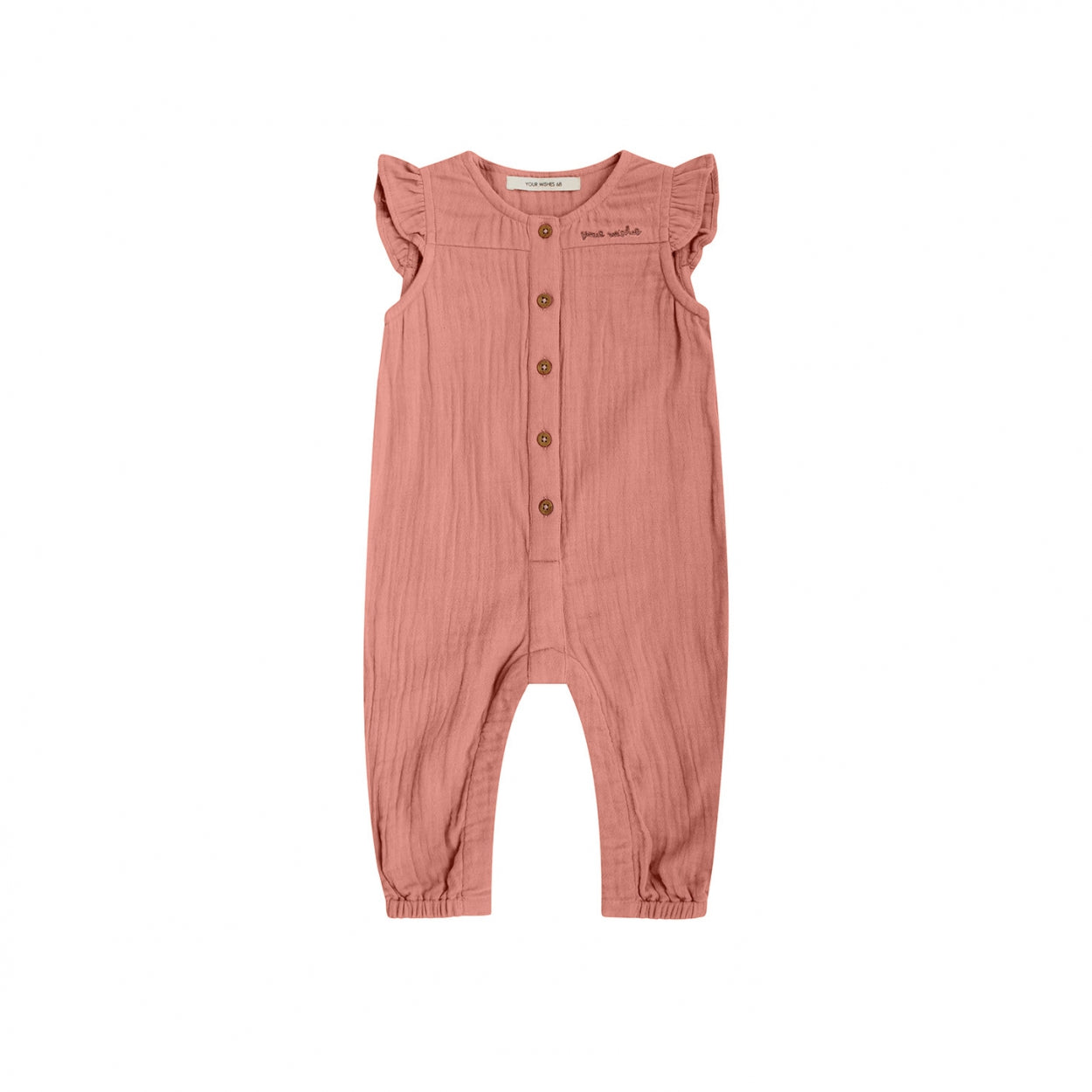Een luchtige jumpsuit van mousseline kwaliteit in een roze kleur. De schouders van deze jumpsuit zijn afgewerkt met ruches. De jumpsuit sluit met houten knoopjes aan de voorzijde en drukknoopjes tussen de beentjes. Een heerlijk item voor de zomer!