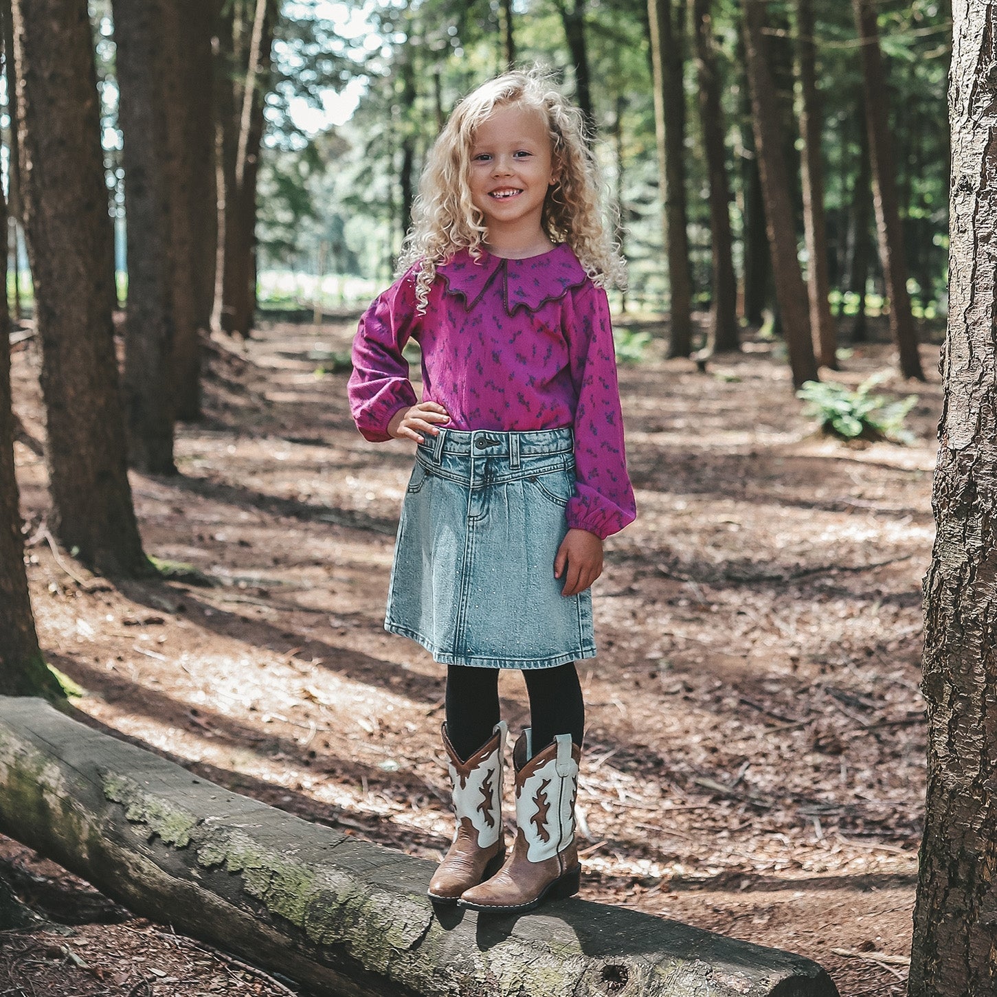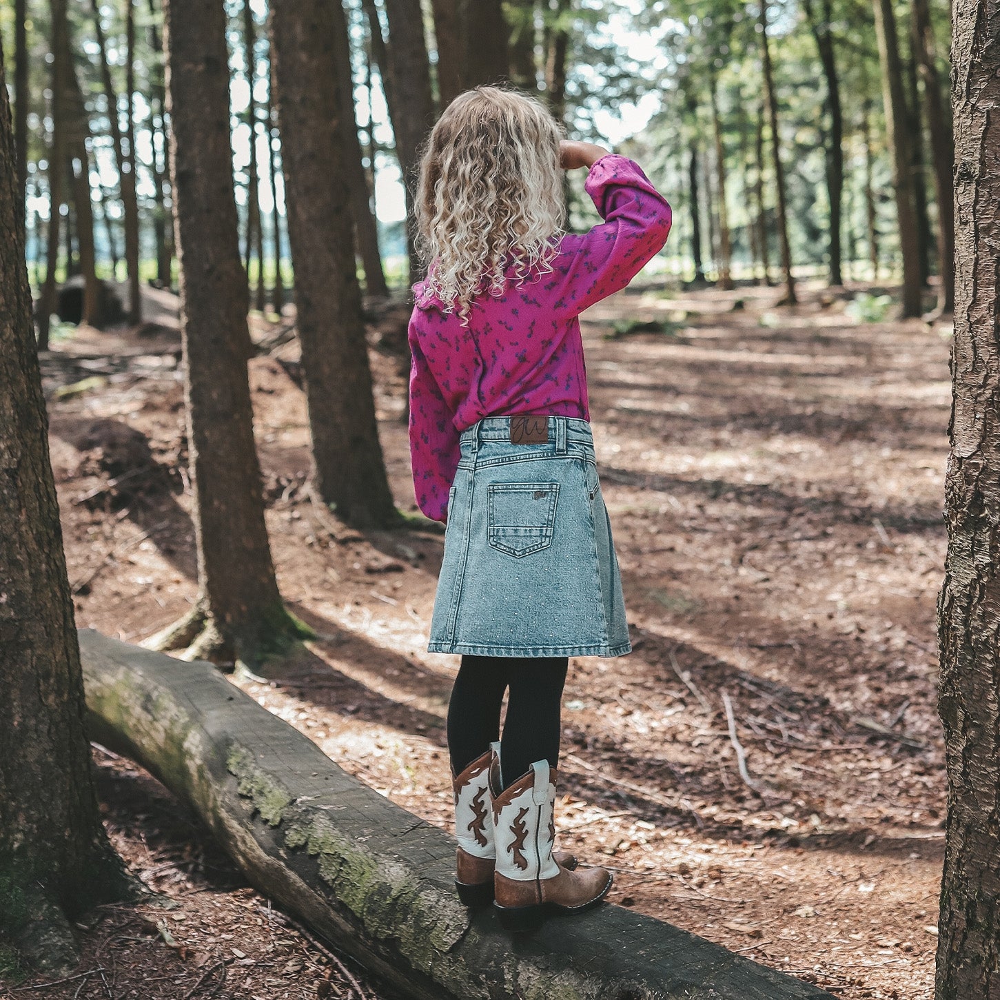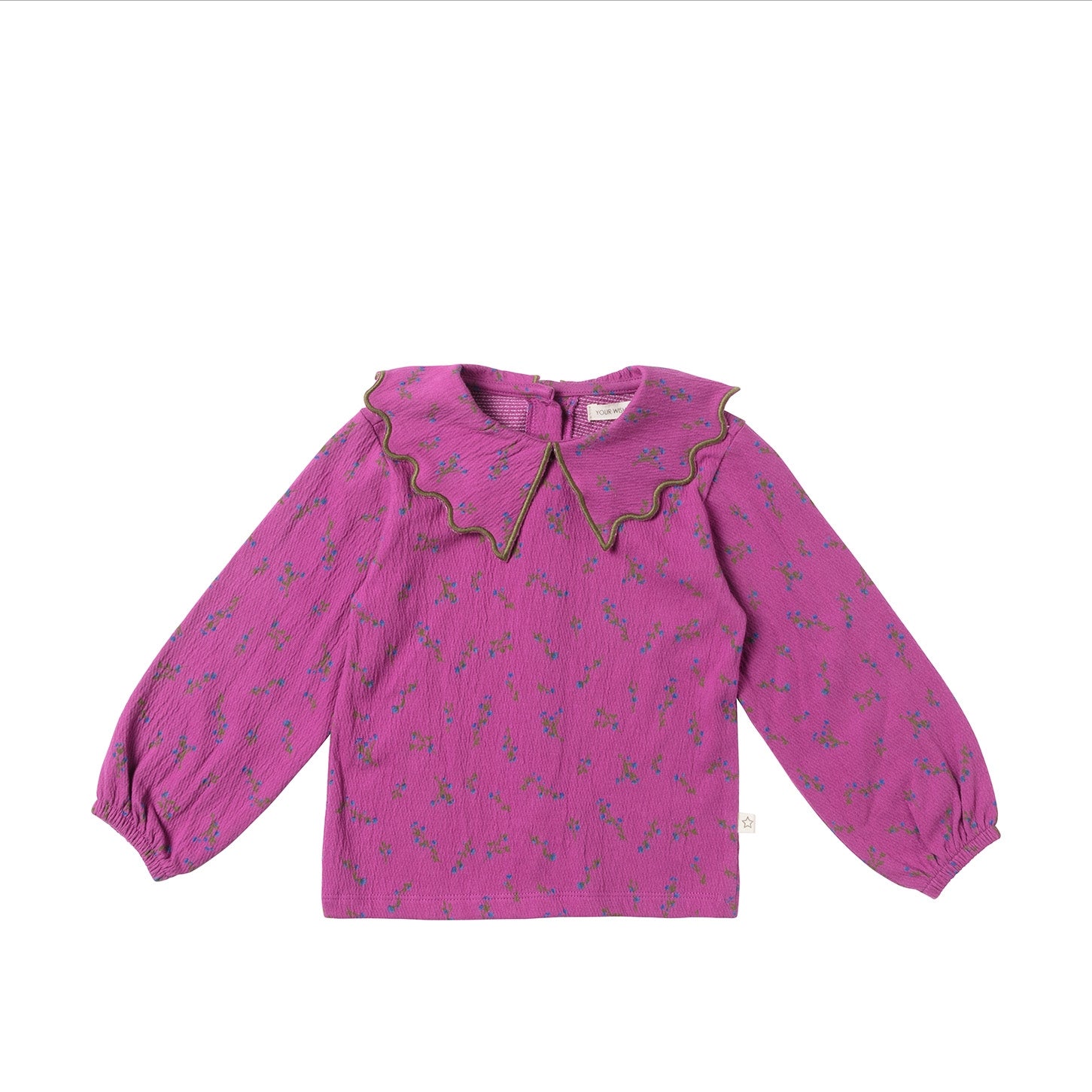 Bloom in style with our antique flower collar top. Deze top is verkrijgbaar vanaf maat 80 tot en met 140 en is gemaakt van onze bekende structured jersey, een gebreide jersey kwaliteit met een unieke crinkle textuur. De stof is voorzien van een all-overprint van fijne bloemetjes op een fuchsia gekleurde basis, wat een speelse en elegante uitstraling geeft. Met de antique flower collar is voorzien van knoopjes of de achterkan en is voor elke gelegenheid. Combineer deze prachtige top met de Stretch Denim Glitter Skirt Sky Blue voor een complete look, en laat jouw kleine meid stralen!