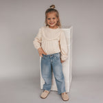De jeans is uitgevoerd in een lichte denim wassing en afgewerkt met verfijnde details, zoals de subtiele stiksels en het klassieke five-pocket design. De zachte denimkwaliteit voelt prettig aan op de huid en biedt voldoende bewegingsvrijheid voor actieve meiden.