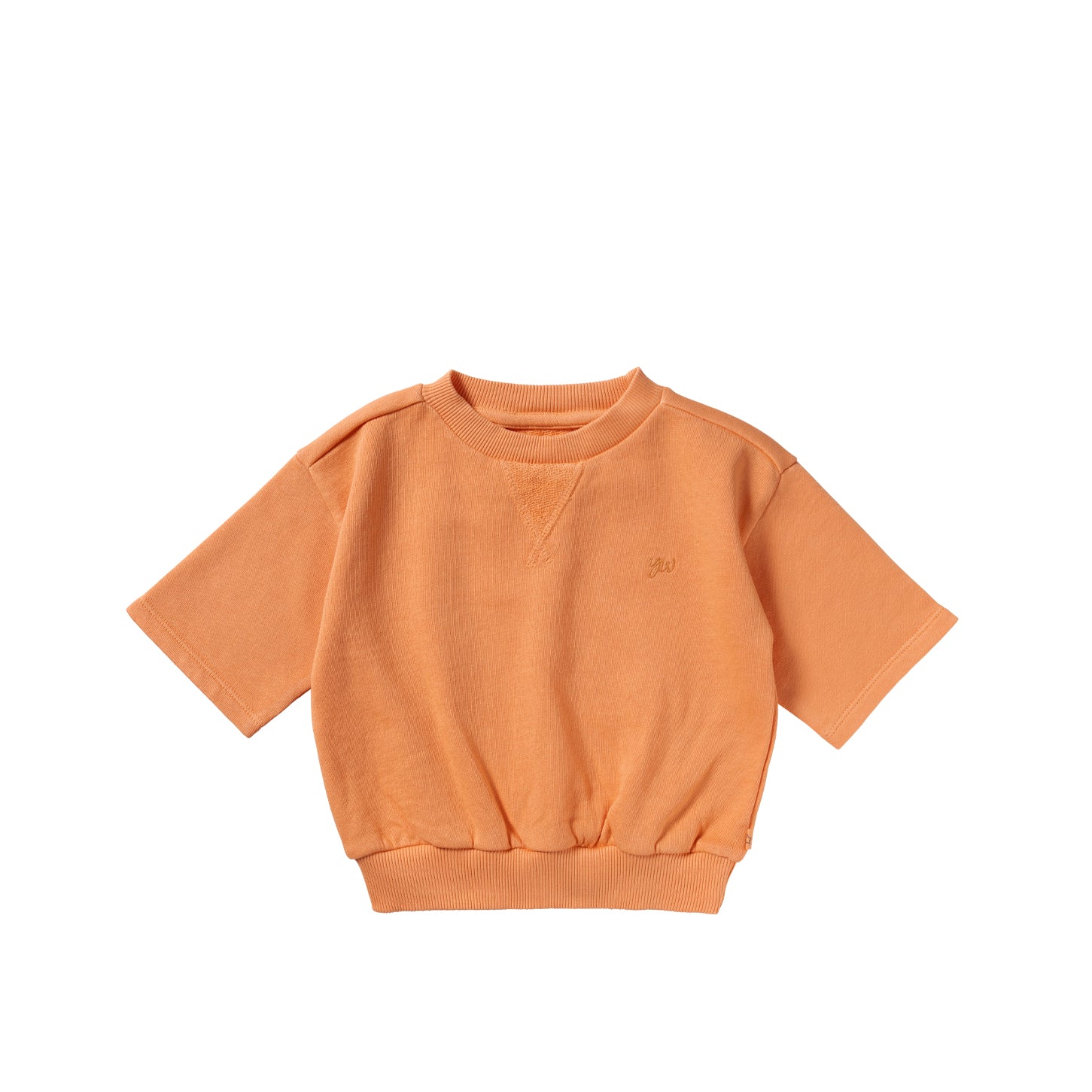Deze sweater met korte mouwen combineert het comfort van een trui met de luchtigheid van een T-shirt, perfect voor het voorjaar, frisse zomerdagen of als extra laagje. De zachte stof voelt comfortabel aan op de huid en biedt voldoende bewegingsvrijheid. Dankzij de elastische boord aan de onderzijde krijgt de sweater een speelse, licht bloezende pasvorm. De warme oranje kleur zorgt voor een frisse, trendy look en is makkelijk te combineren met een short, legging of jeans. Het subtiele geborduurde detail op de borst geeft de sweater een minimalistische en stijlvolle uitstraling.