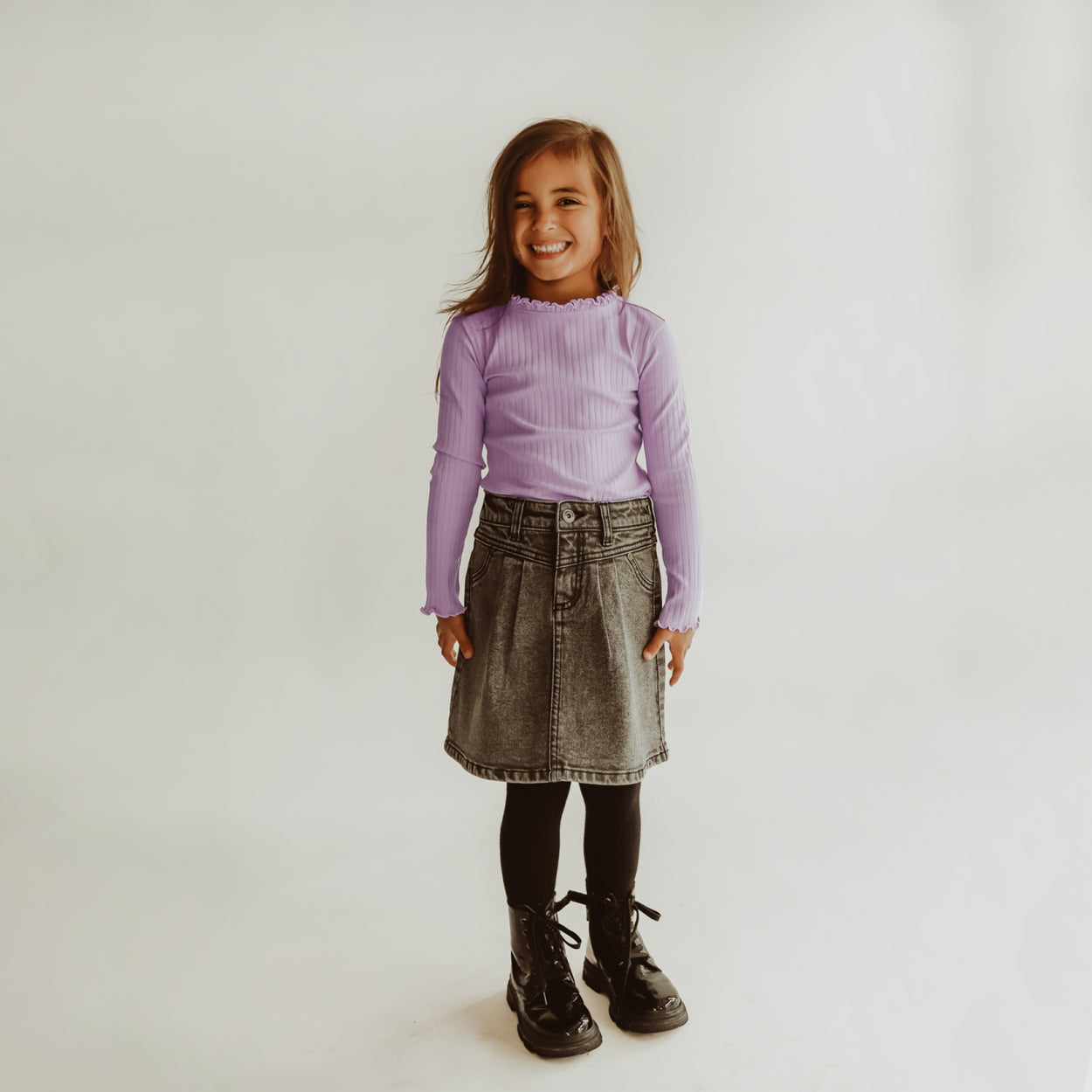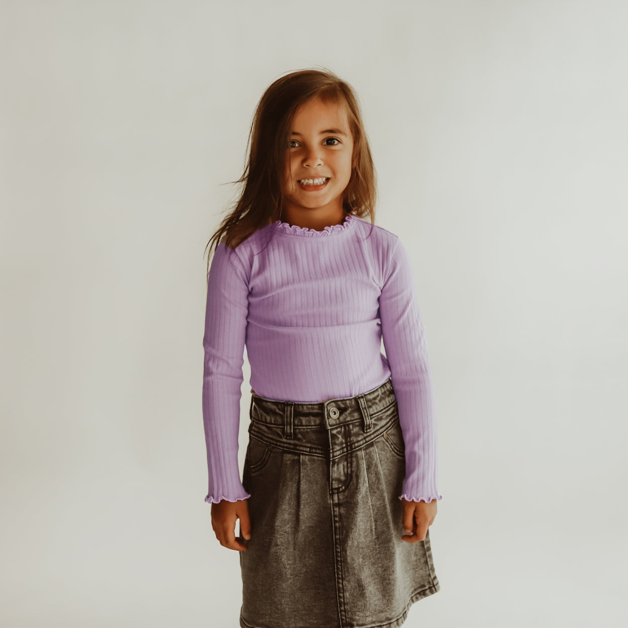 Het Jade longsleeve shirt is uitgevoerd in een hele fijne stretchy ribstof en ik verkrijgbaar in maat 98/104 tot 146/152. Het shirt sluit aan de achterkant met drie knoopjes en is afgewerkt met een ruffle detail op de kraag en aan het uiteinde van de mouwen. De lila ribstof is een perfecte match met de Nikita flared legging. Combineer deze items samen en creëer een fijne co-ord set! Het Jade shirt met lange mouwen is zo makkelijk te combineren met andere items, dat deze onmogelijk kan ontbreken in de kledingkast van jouw kindje!