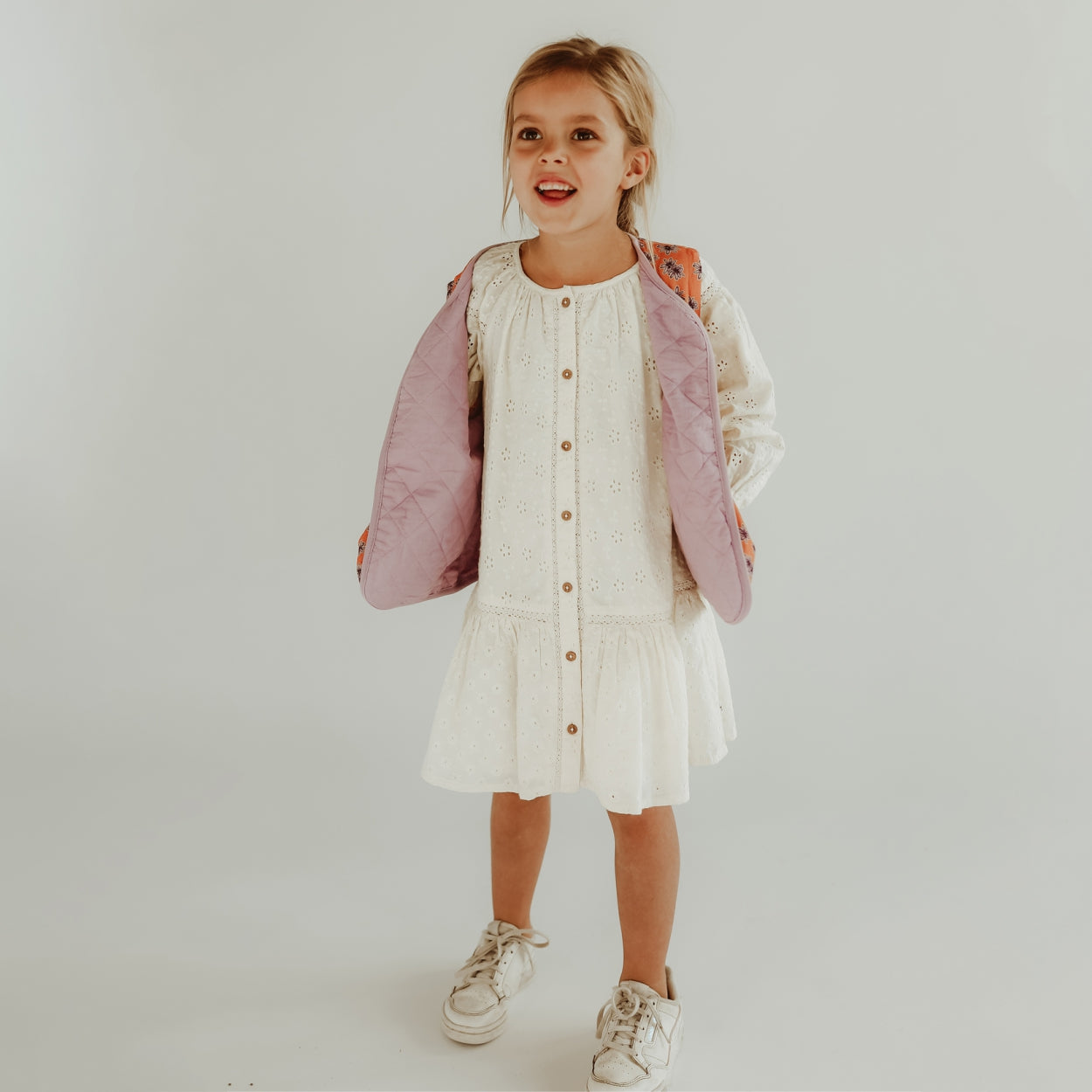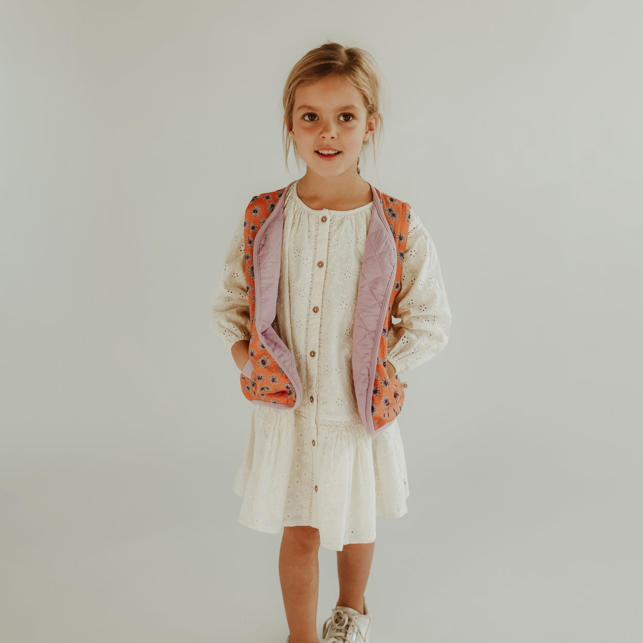Op zoek naar het ultieme kledingstuk om de zomergarderobe van je kind op te fleuren? Dit feloranje gilet met lila bloemen is een geweldige keuze! Het is niet alleen een mooie en kleurrijke toevoeging aan de garderobe van je kind, maar het is ook gemakkelijk te combineren met verschillende outfits. Dit gilet is speciaal ontworpen voor kinderen en is gemaakt van hoogwaardig materiaal dat comfortabel is om te dragen. De heldere oranje kleur en de levendige lila bloemen maken het een opvallend kledingstuk dat gegarandeerd de aandacht zal trekken. Het gilet is aan twee kanten te dragen, dus extra veel opties om mee te combineren.