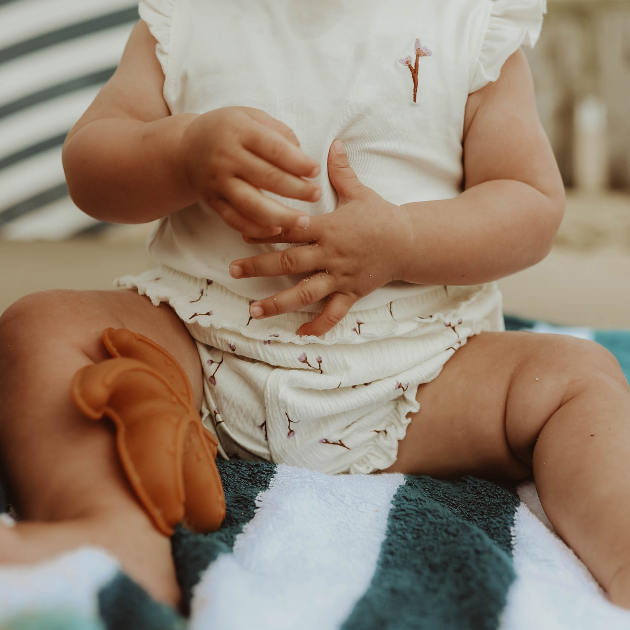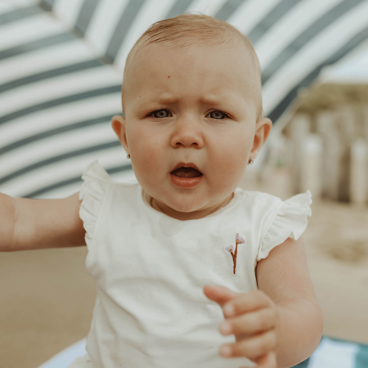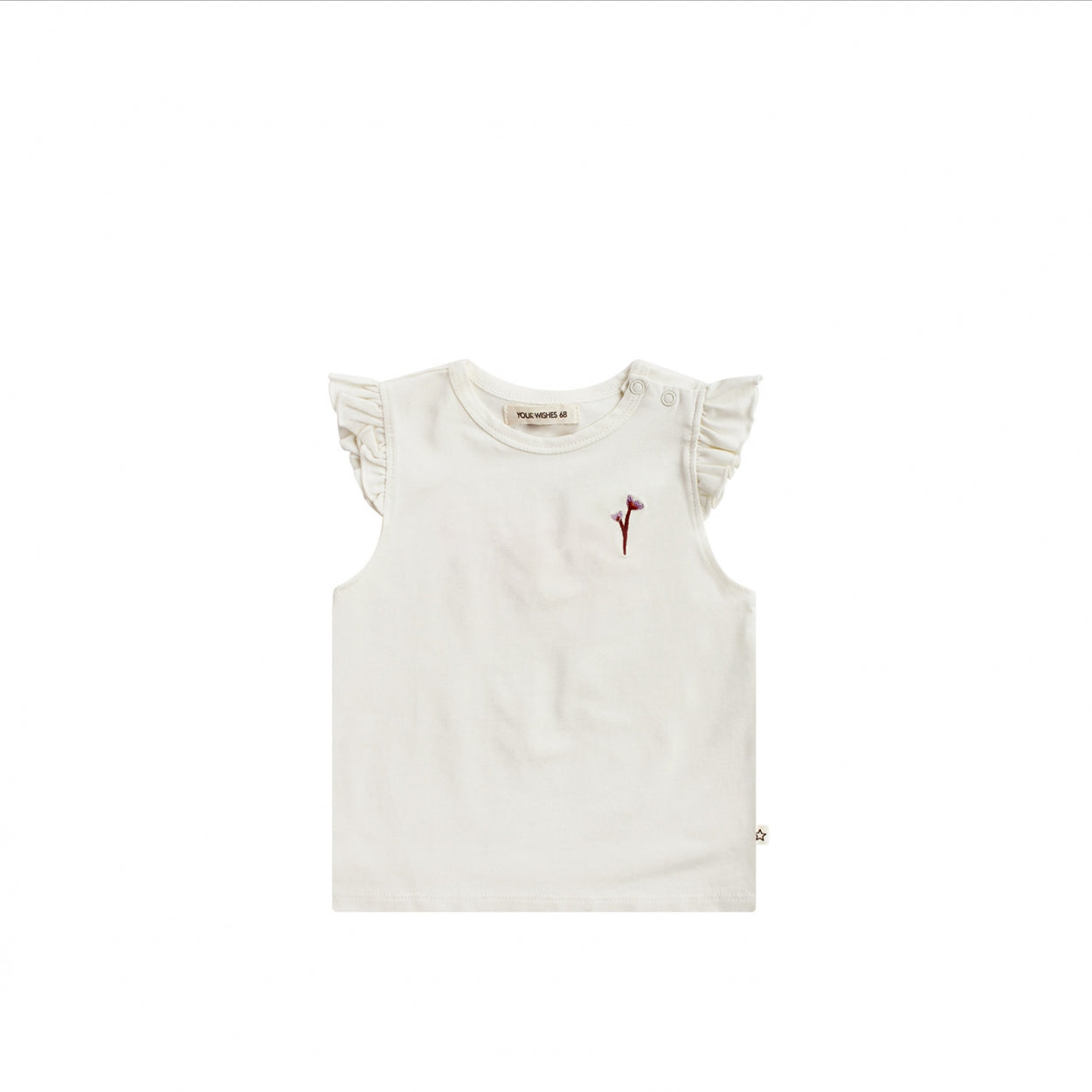Een schattige top met ruches voor je baby meisje. De top is voorzien van een lief geborduurd detail. Dankzij de drukknopen bij de hals kun je de top eenvoudig aan- en uittrekken.