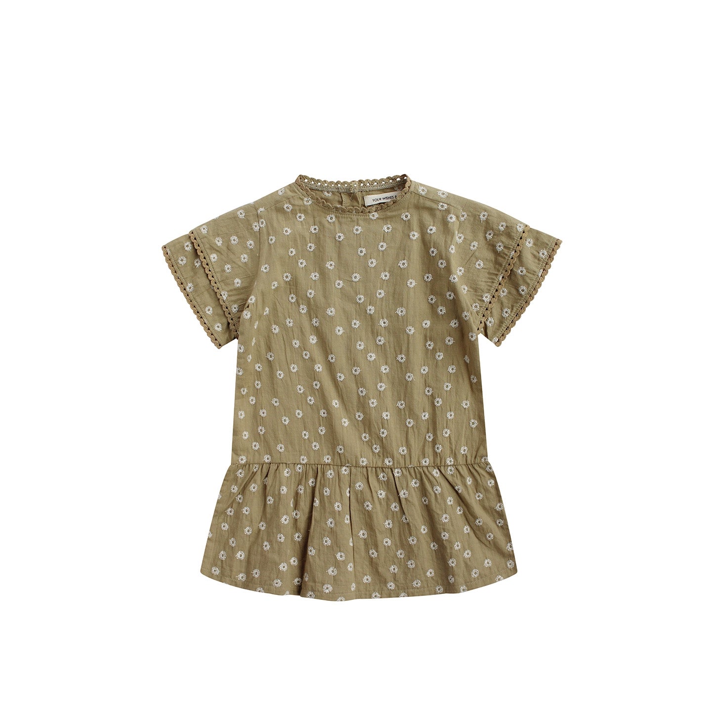 Een top met volants. De licht geweven kwaliteit is perfect voor de zomer. De mooie lichtgroene kleur is voorzien van witte geborduurde bloemen. Deze top heeft wijd uitlopend model, een sluiting in de hals en volant details.