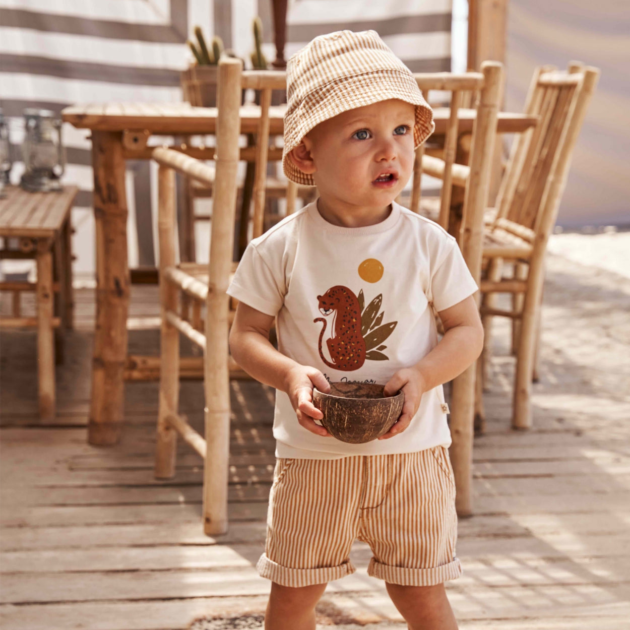Een zonnehoedje van stretch denim met verticale streep. Een zonnehoedje is ideaal voor de zomer om je kleintje te beschermen tegen de zon.