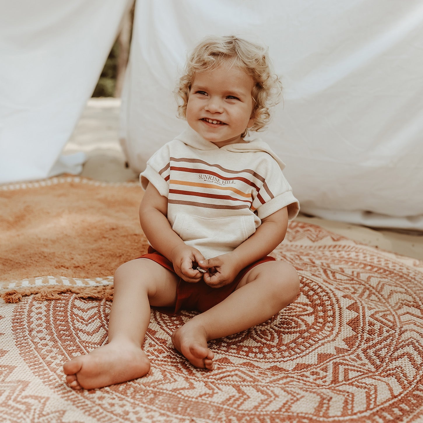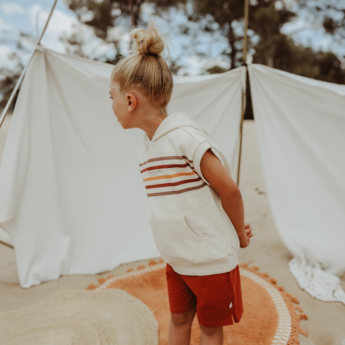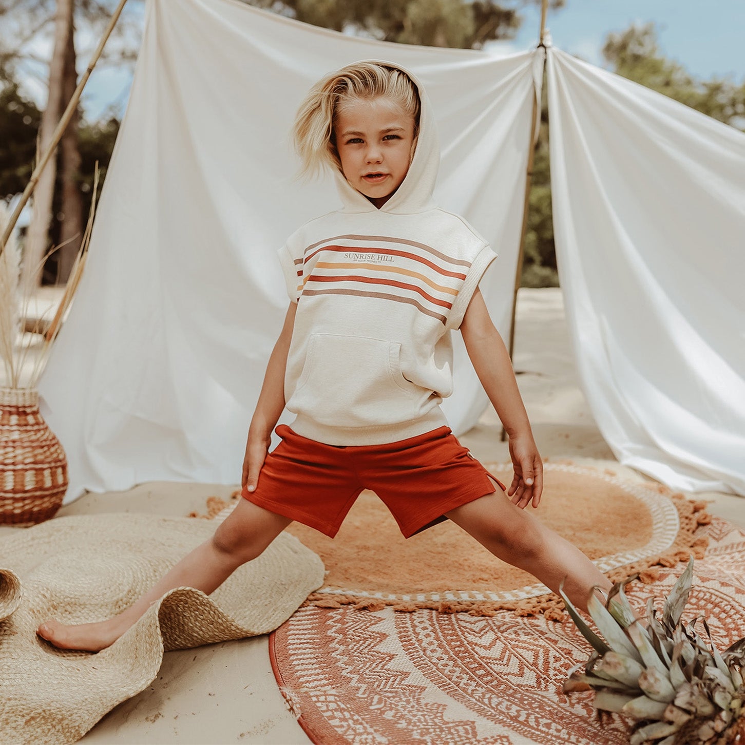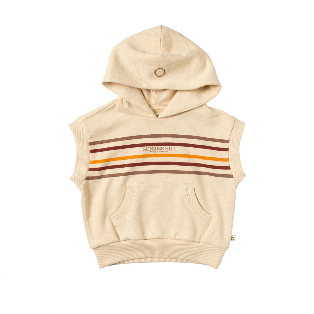 De Pelle is eigenlijk een spencer met capuchon en is verkrijgbaar vanaf maat 80 tot 140. De trui is uitgevoerd in een combinatie van katoen en elastaan en is aan de onderkant afgewerkt met elastiek voor de mooiste pasvorm. Het grootste voordeel aan de Pelle trui zonder mouwen is het feit dat je dit item meerdere seizoenen door kunt dragen. Op warme dagen met blote armen en wanneer het kouder wordt doe je er gewoon een T-shirt met lange mouwen onder, ideaal toch? Op de voorkant van de Pelle spencer met capuchon vind je verschillende kleuren strepen met sunrise hill erop en een kangoeroezak. Combineer de Pelle trui met een stoere spijkerbroek of de Jorn cargobroek en maar de stoere look compleet!