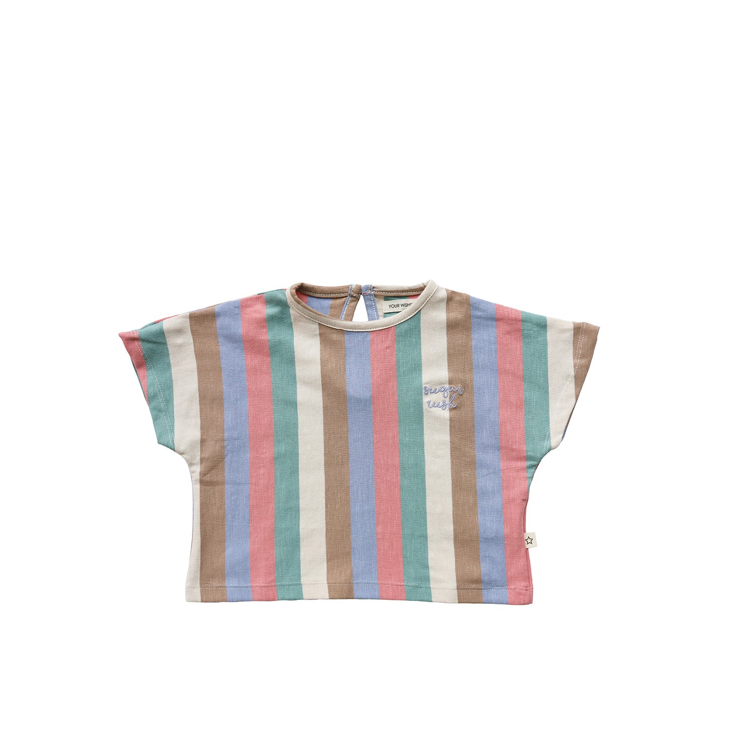 Haal een stukje zoete lente- en zomersfeer in huis met het Multi Stripes Cropped Tee uit de Sugar Rush collectie van Your Wishes. Dit vrolijke en speelse T-shirt is gemaakt van slub jersey en is voorzien van gebreide pastelstrepen die langer mooi blijven, dankzij het gebruik van gekleurd garen in plaats van prints. De cropped fit zorgt voor een trendy look die ideaal is voor zonnige dagen en heeft aan de achterkant een kleine opening met knoopsluiting.