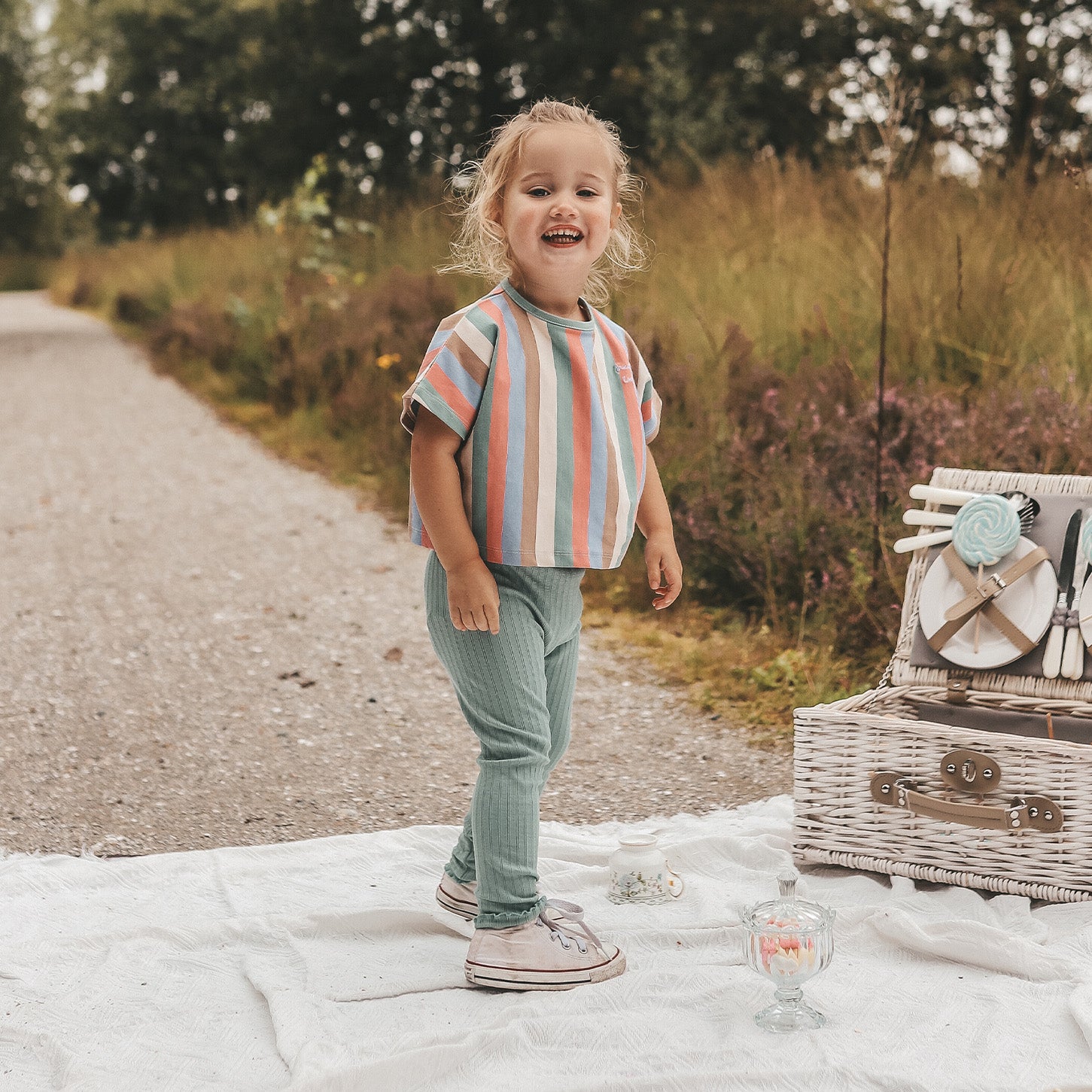 Gemaakt van 95% katoen en 5% elastaan, biedt dit shirt de hele dag comfort en bewegingsvrijheid. Combineer de Cropped Tee met de Multi Stripes Ruffle Shorts voor een pastelkleurige co-ord set, of draag het met een eenvoudige legging voor een casual, speelse outfit!