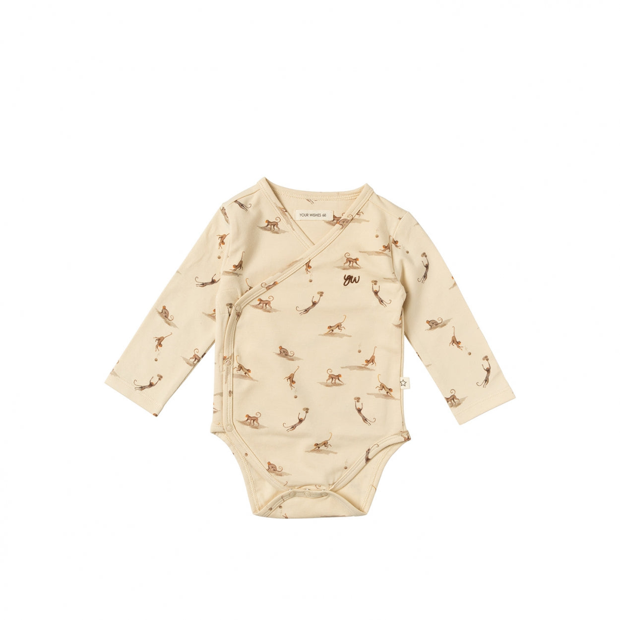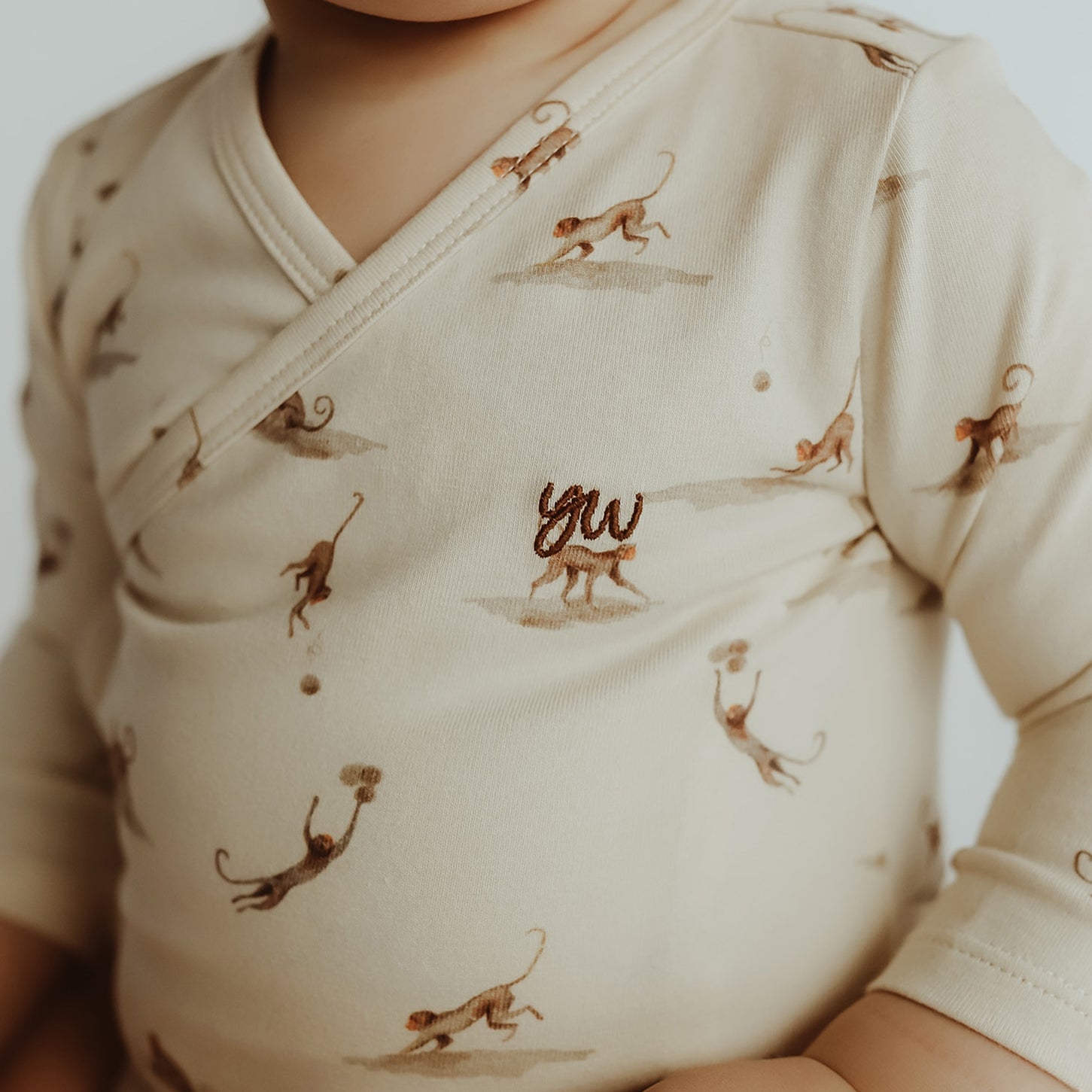 It’s time for monkey business met de Niven overslagromper met lange mouwen, verkrijgbaar vanaf maat 50 tot 74. De romper is uitgevoerd in een combinatie van katoen en elastaan, waardoor het een rekbare stof is die goed rond het lichaam van jouw kindje aansluit en de warmte goed vasthoudt. Het Niven overslagrompertje maakt het aankleden van jouw kindje wel heel makkelijk én de romper hoeft niet over het hoofd heen aangetrokken te worden. De romper leg je helemaal open, je doet de armpjes door de mouwen en vervolgens vouw je de linker flap helemaal over de buik en maak je deze vast met de drukknopen. Vervolgens vouw je de rechter flap weer over de buik heen en maak je ook deze vast met de drukknopen. De onderkant van de romper kan geopend worden met drukknopen, waardoor niet de hele romper uit hoeft wanneer je de luier wilt verschonen. Ideaal, toch? Daarnaast heeft de romper een schattige apenprint die gebaseerd is op een handgeschilderd design. Combineer de Niven overslagromper nog met de Jesse broek in dezelfde apenprint of kies voor de Marcus broek in een matchende kleur en maak de look compleet.