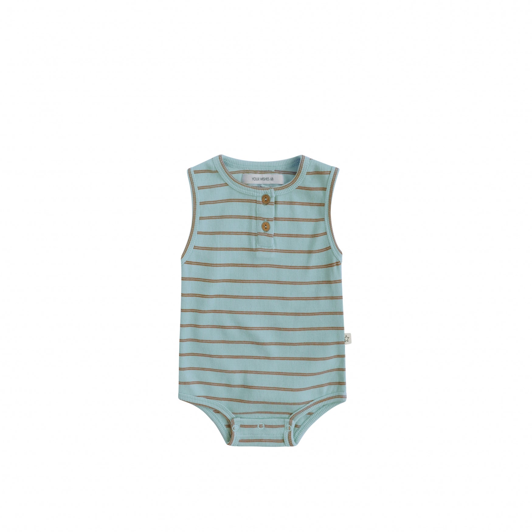 Een gestreepte romper van mooie rib kwaliteit in een lichtblauwe tint. De mouwloze romper is voorzien van twee houten knoopjes aan de voorzijde.