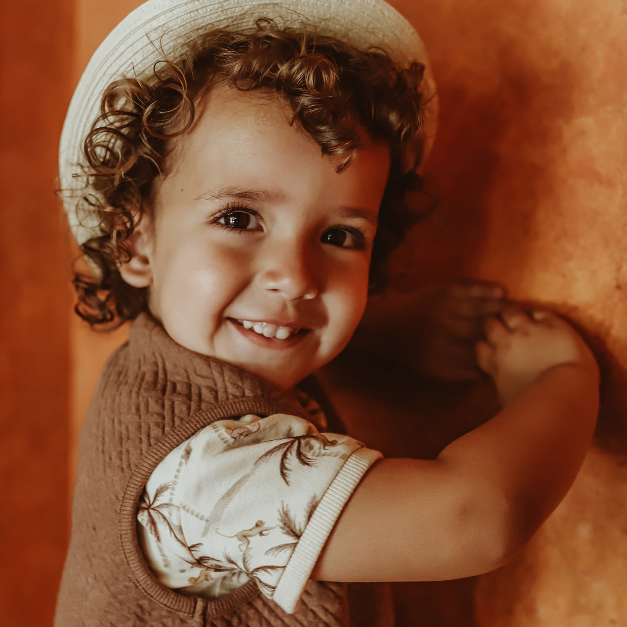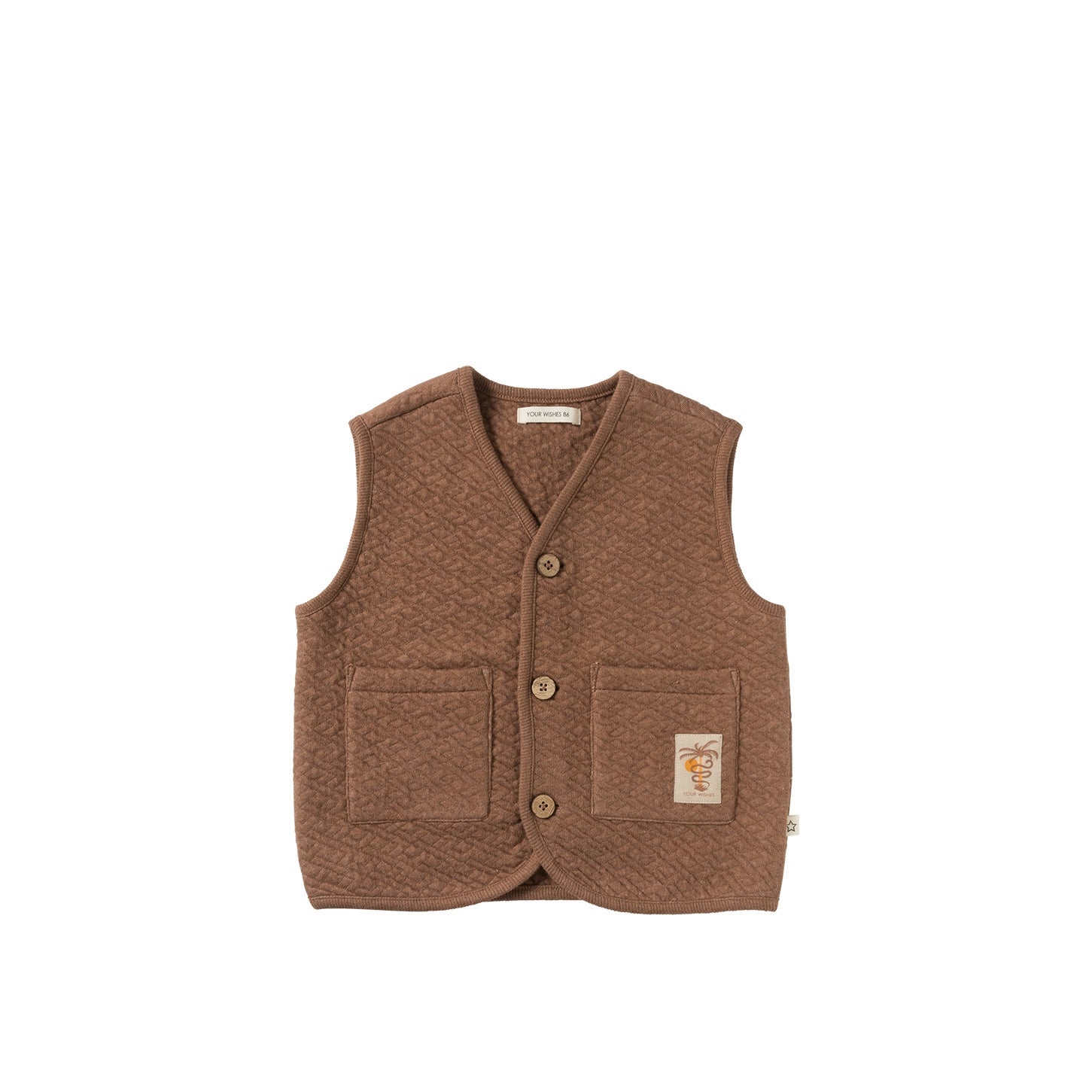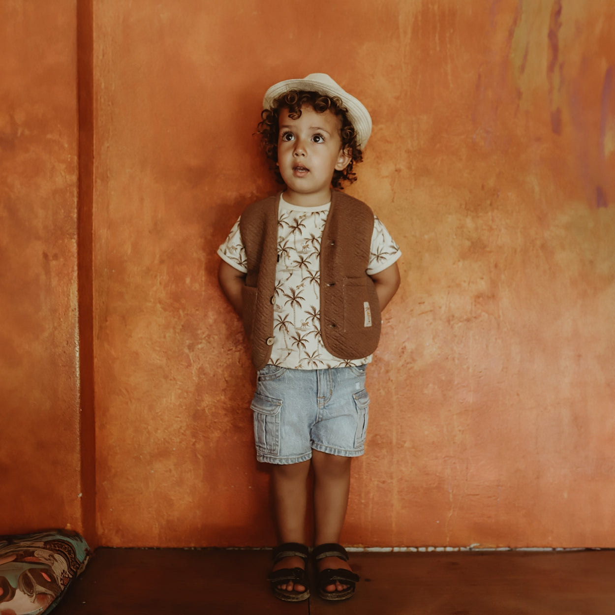Een gilet kan tegenwoordig niet meer ontbreken in de garderobe van jouw kindje en dat geldt ook voor het Pablo gilet. Dit gilet is uitgevoerd in 100% katoen en is verkrijgbaar vanaf maat 80 tot 140. Het gilet is afgewerkt met houten knopen op de borst, twee steekvakken en een uniek mozaïekpatroon. Op één van de zakken is een stoere patch geborduurd van een palmboom met een slang. Door de hazelnoot bruine kleur van het Pablo gilet is het de perfecte match met de Jorn cargobroek, maar het is ook leuk te combineren met een stoere Floyd spijkerbroek.