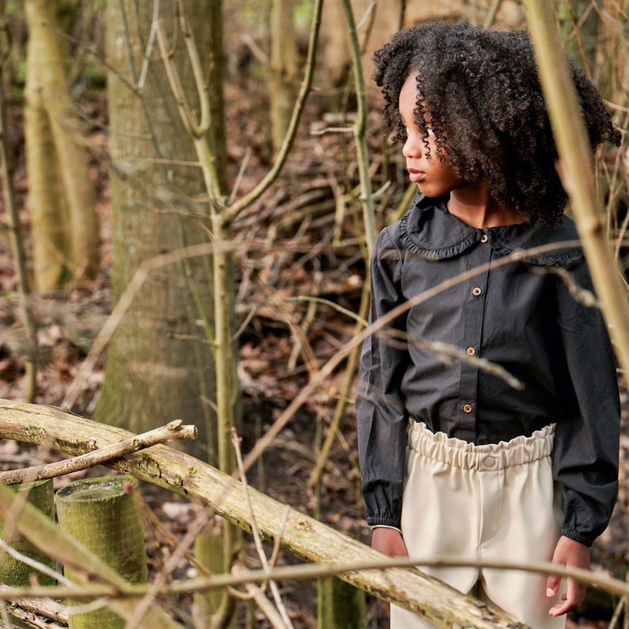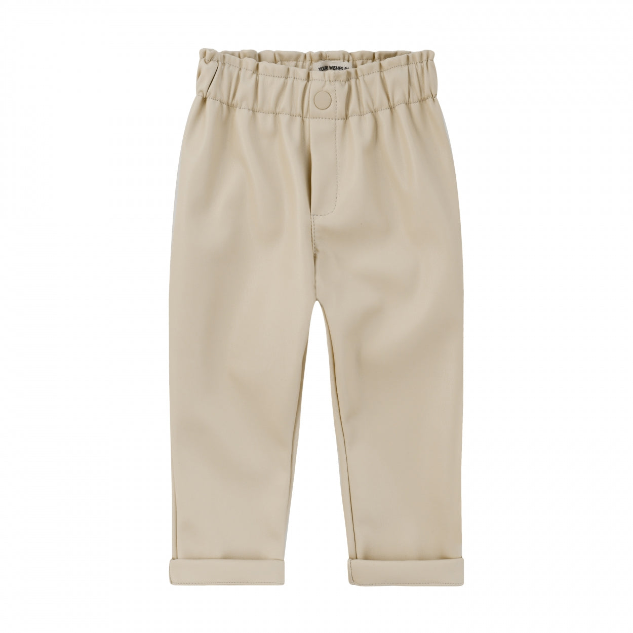 Een lange broek van zacht PU leer in een warme wit tint. De broek is voorzien van een elastische paperbag-band. Het model is voorzien van omgeslagen pijpjes.