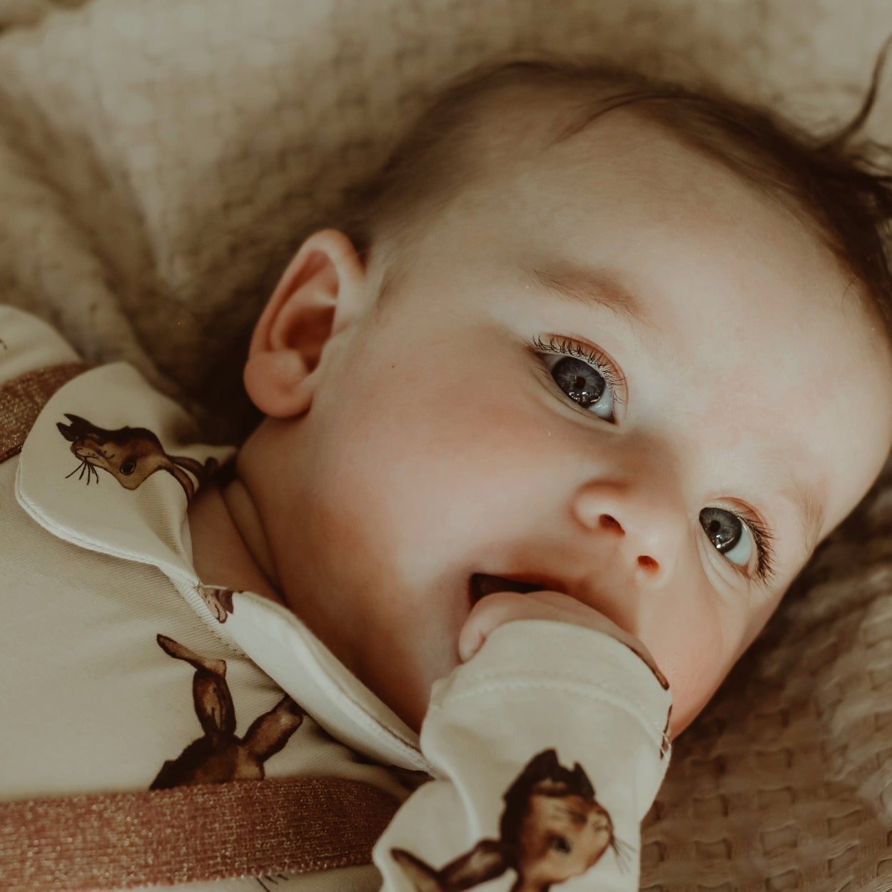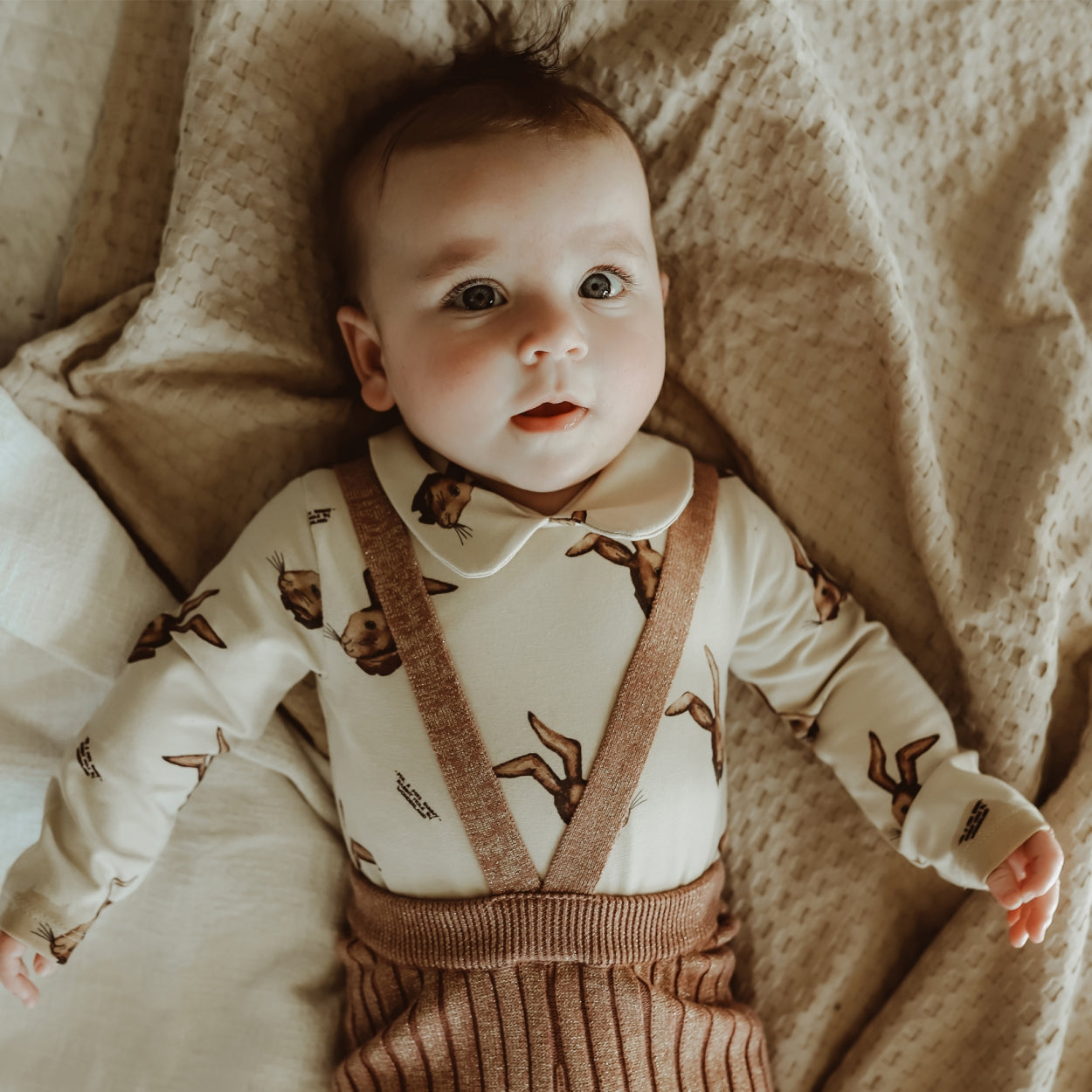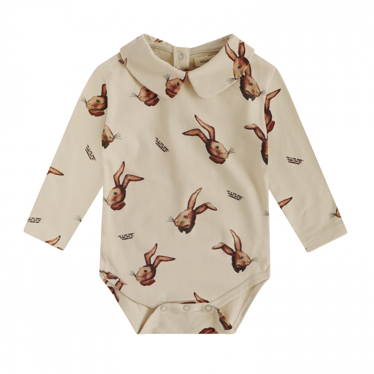 Deze romper heeft een zachte kwaliteit en is voorzien van een speelse print met aquarel geschilderde konijnen in warme herfstkleuren. Een schattige romper met peter pan kraag en een drukknoopsluiting tussen de beentjes en in de nek.