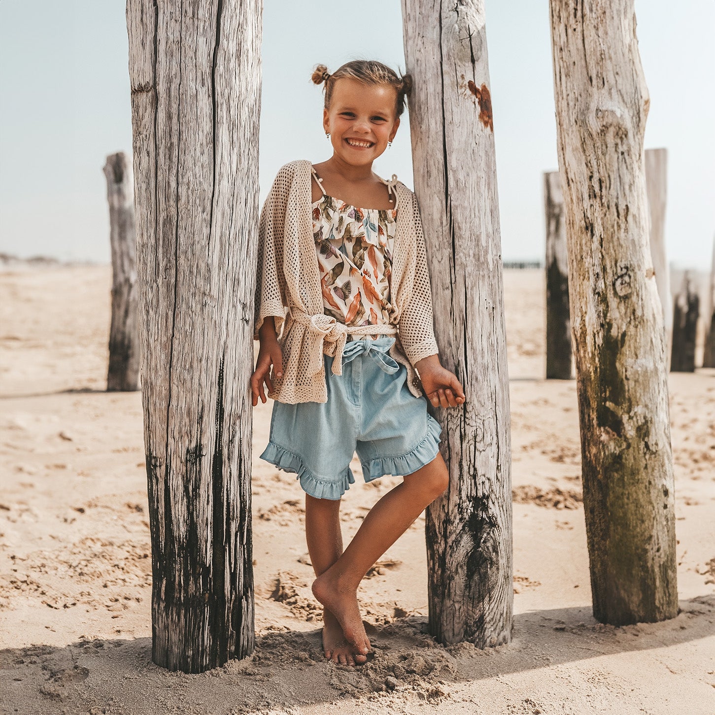 De Regina short is de ideale toevoeging aan de zomergarderobe van jouw kindje en is verkrijgbaar vanaf maat 80 tot 140. De short is uitgevoerd in 100% katoen en is daardoor heerlijk luchtig. De Regina short sluit door middel van een knoop met ritssluiting en heeft elastiek in de achterkant van de broeksrand voor de mooiste pasvorm. Verder heeft de short ook een ceintuur die je door de lusjes kunt doen om de broek al helemaal perfect op het lichaam van je kindje af te stemmen, maar je kan de short natuurlijk ook zonder het ceintuur dragen. Het Regina short is eigenlijk met alles wel te combineren, maar wij vinden het de leukste match met de Esmee top en de Rosalyn kimono. Heb jij het fijne Regina short al aan je winkelmandje toegevoegd?