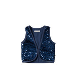 Is jouw kleine meid klaar om te stralen? Dan is deze Velvet Gilet perfect voor haar! Het gilet is volledig afgewerkt met donkerblauwe pailletten en heeft een sluiting aan de voorzijde. Dankzij de stijlvolle pasvorm krijgt het gilet een feestelijke en speelse uitstraling. Verkrijgbaar van maat 80 tot 140.
