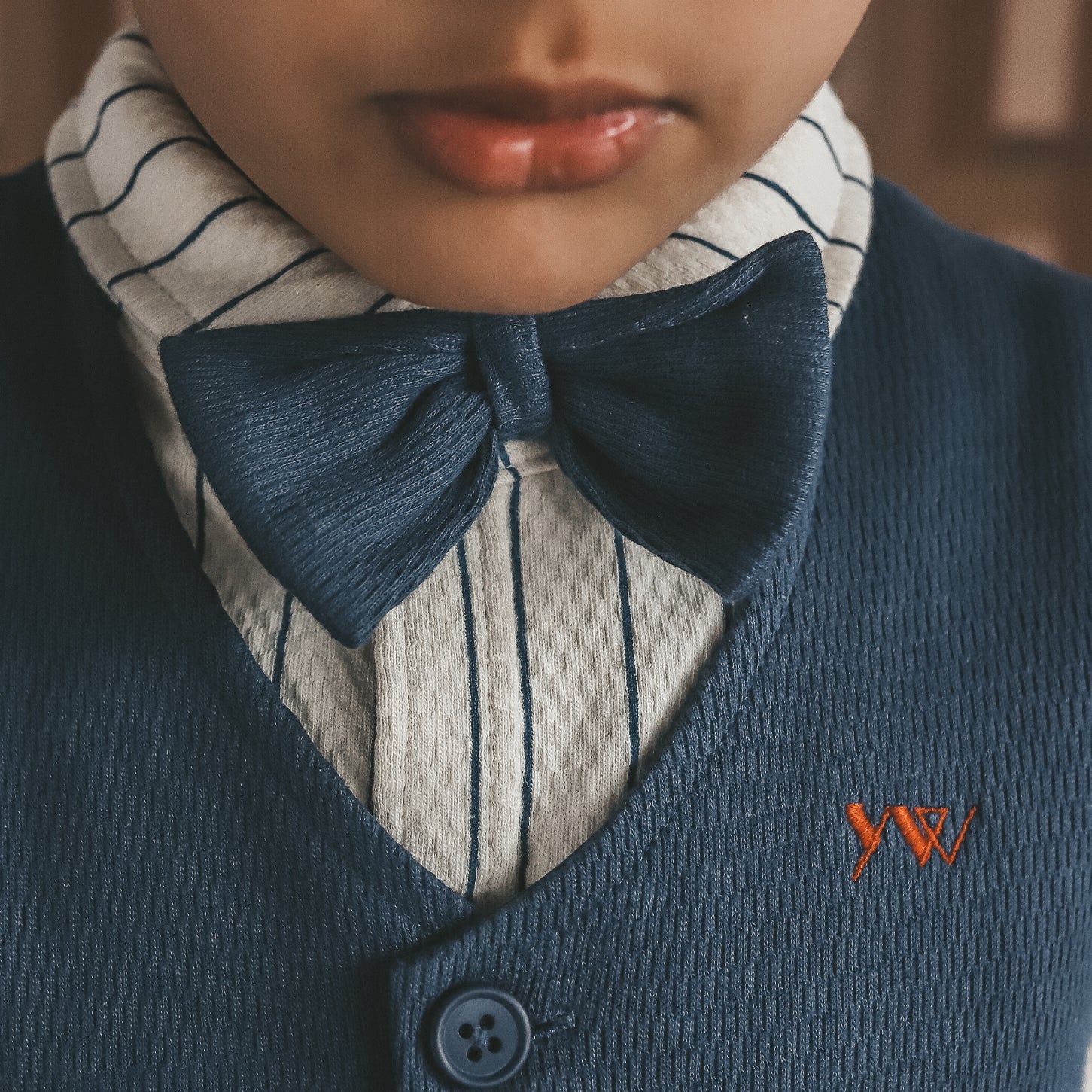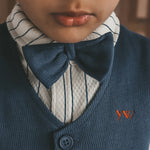 Maak de outfit van je kleintje helemaal af met deze stijlvolle Bow Tie. De strik is verkrijgbaar in één maat en omdat deze verstelbaar is past deze bij elk kindje. Je kunt de elastieken band verstellen door middel van een klein gespje en makkelijk om de nek doen dankzij de klittenbandsluiting. Uitgevoerd in een mooie blauwe, gestructureerde stof die perfect matcht met het Boxy Gilet en Straight Pantalon. Hierdoor kan je een complete look creëren als je de items met elkaar combineert. Een klein detail met groot effect!