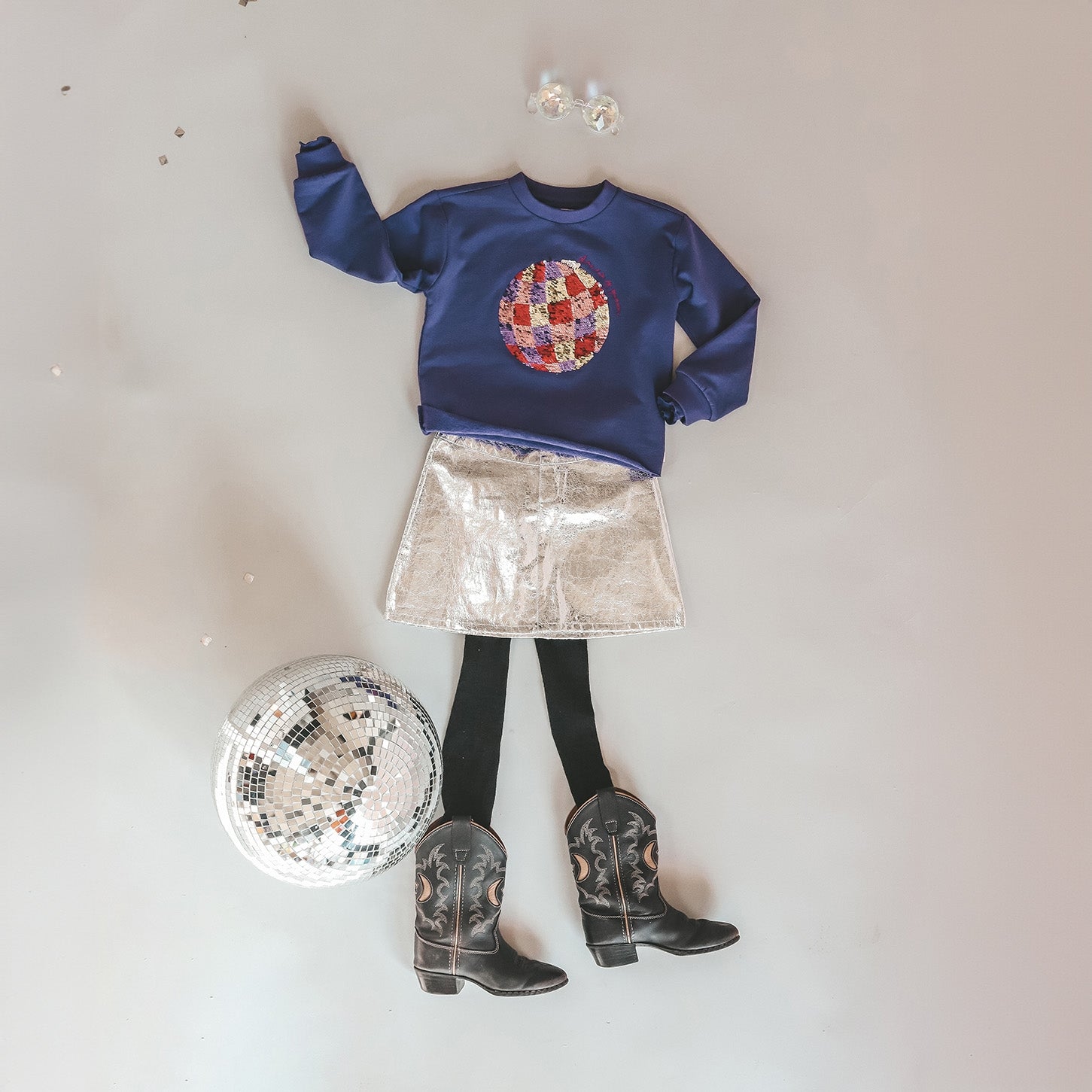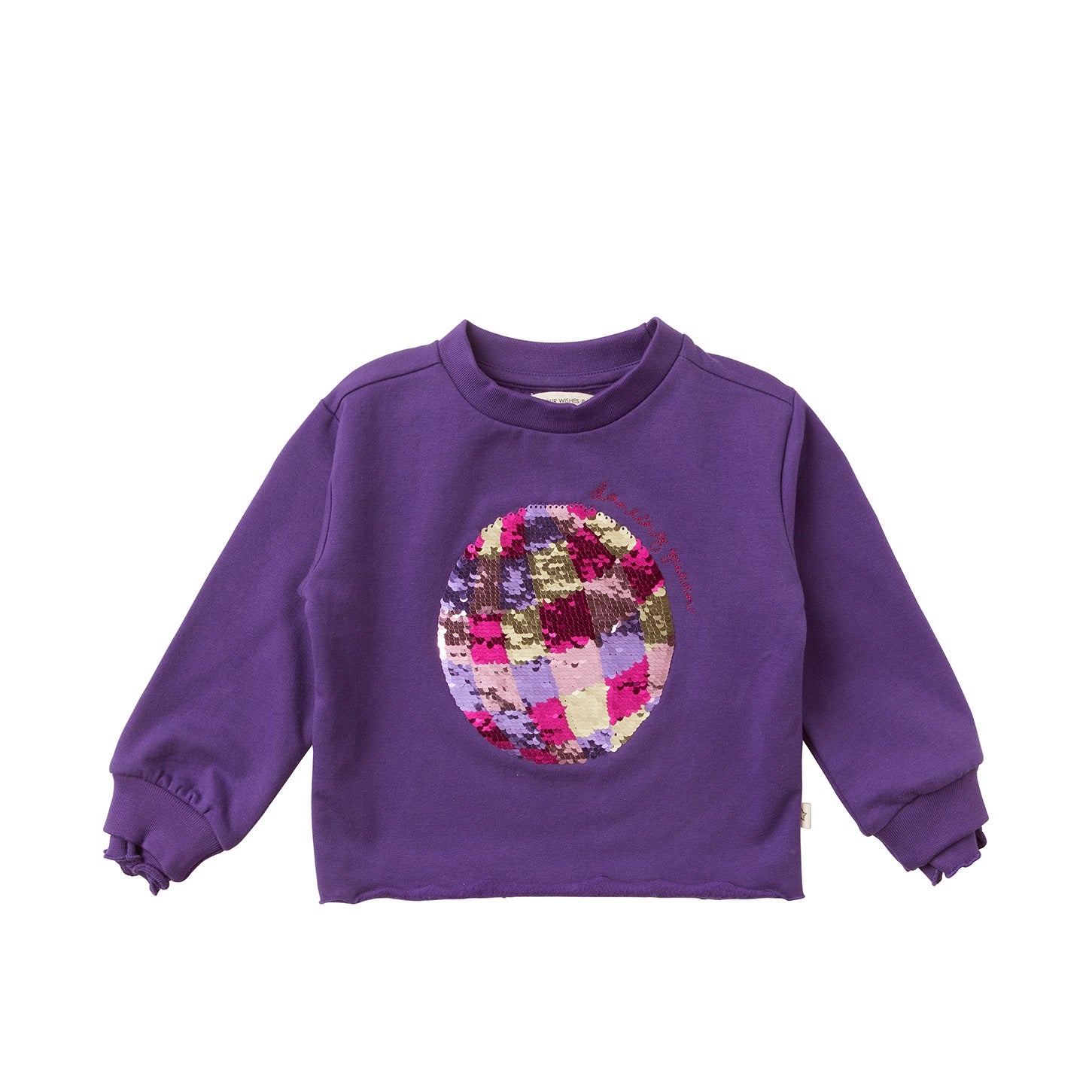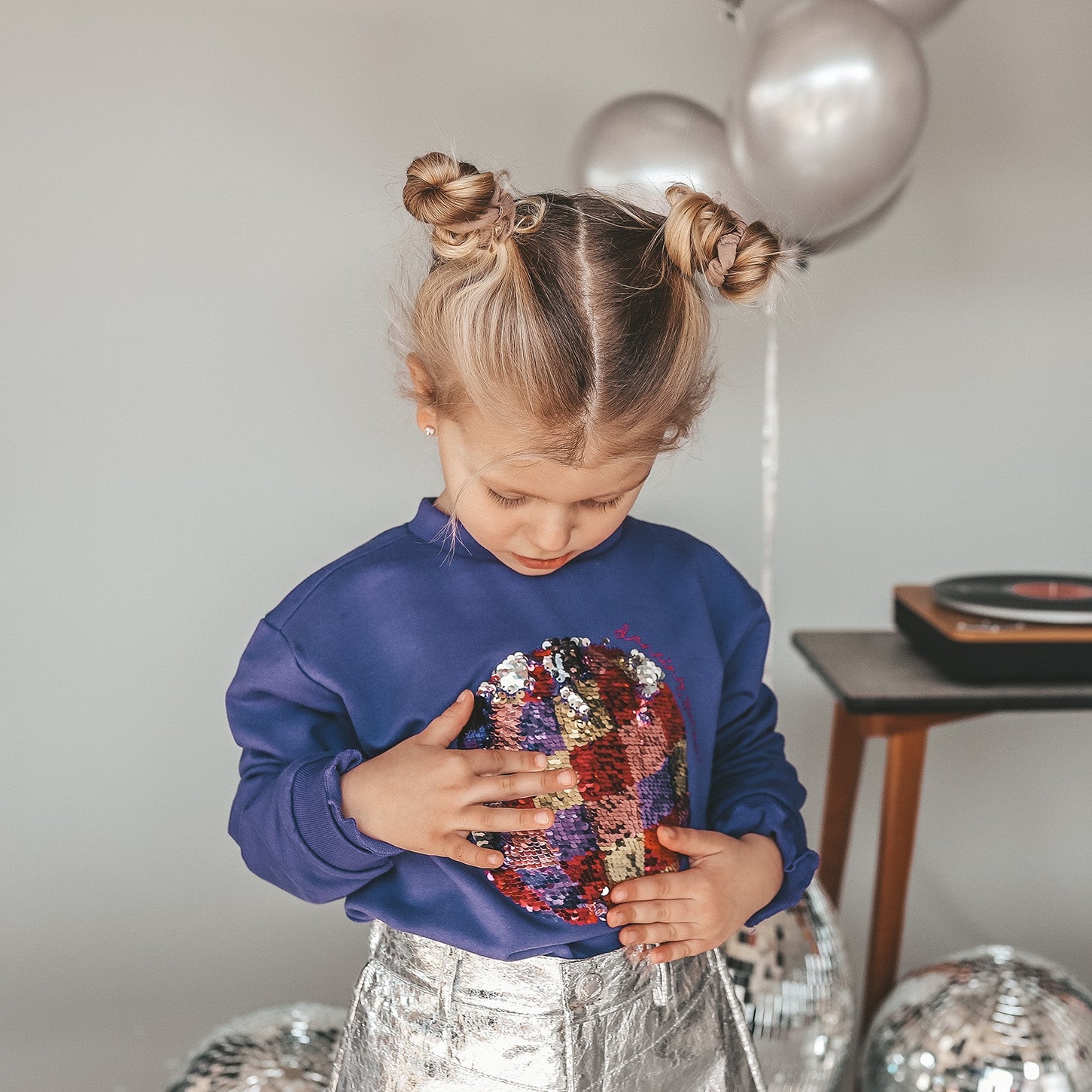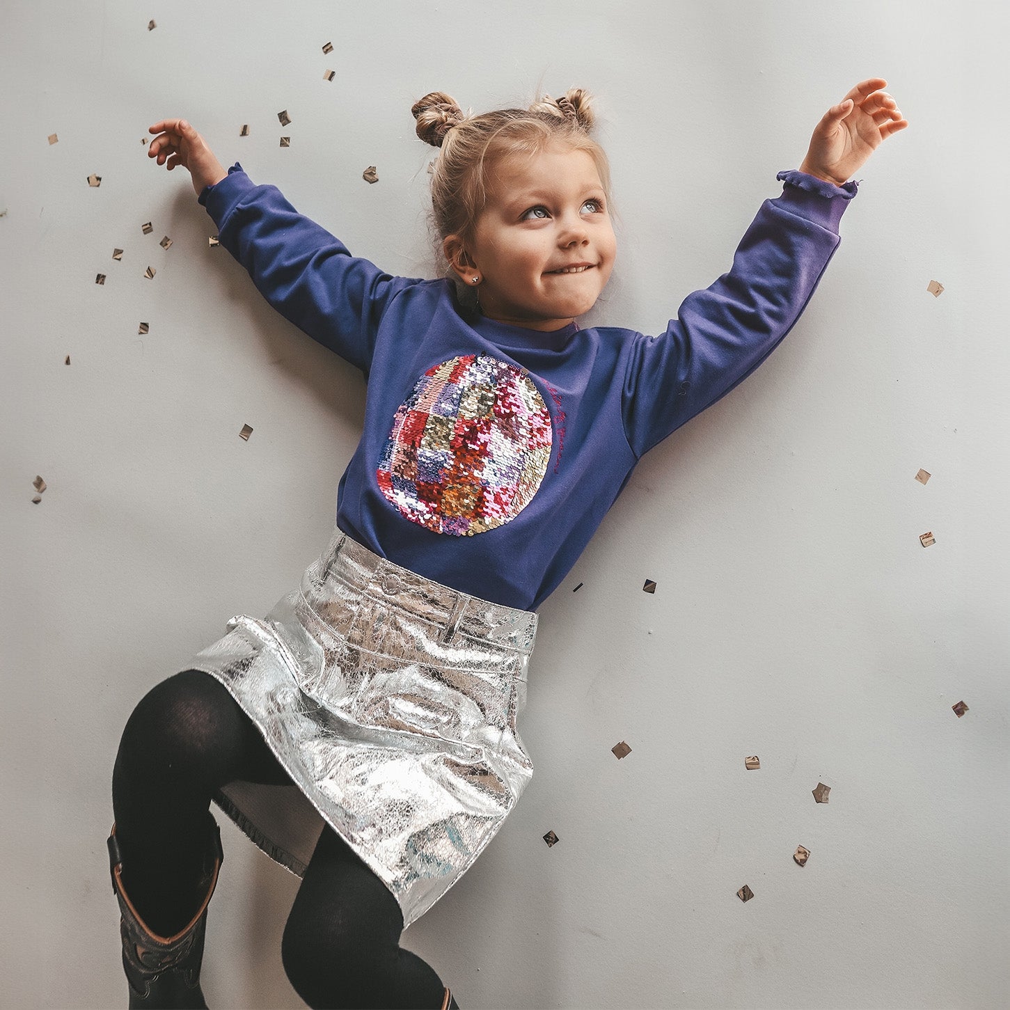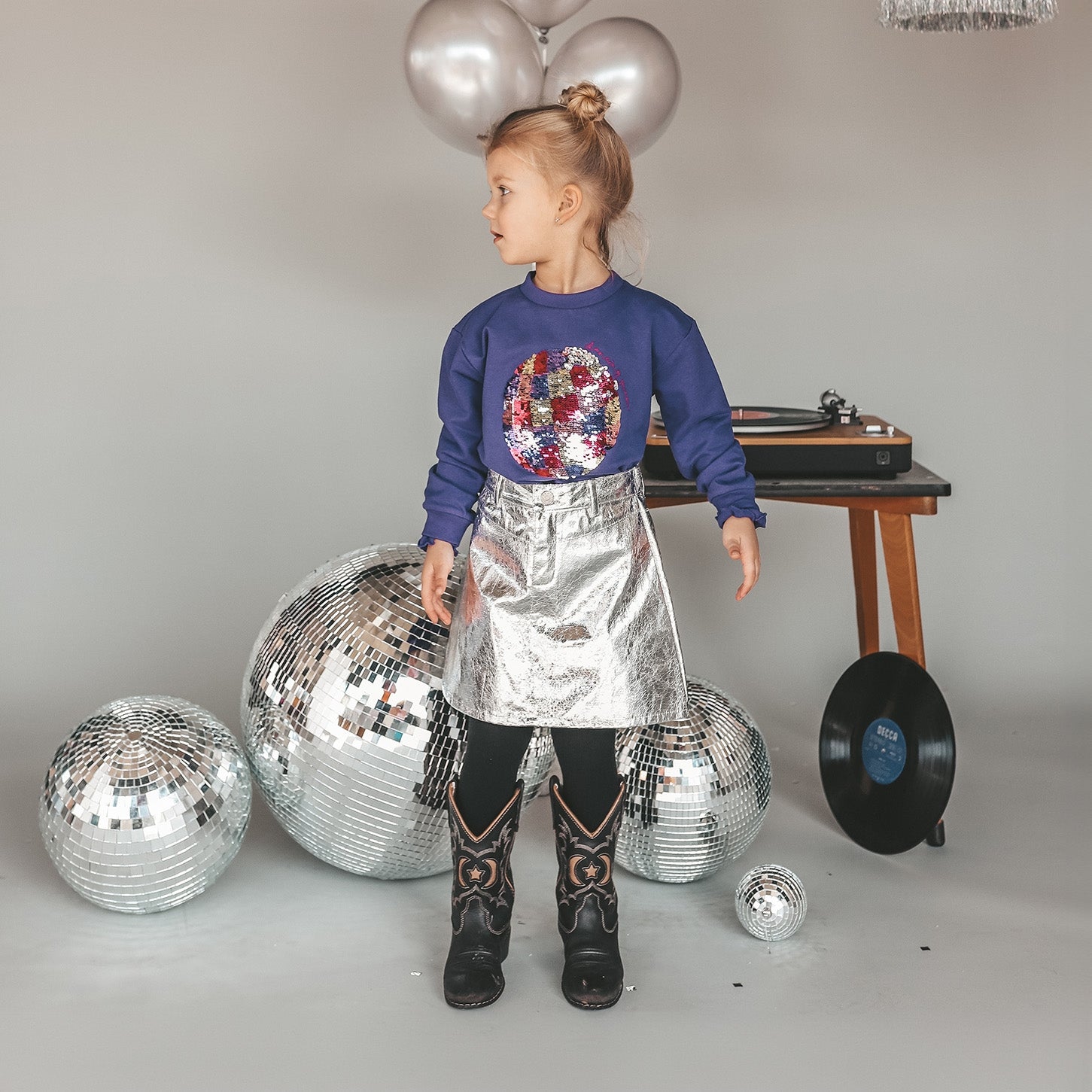 Embrace your inner dancing queen met de Dancing Queen Straight Sweater, verkrijgbaar vanaf maat 80 tot 140. De trui is uitgevoerd in een combinatie van katoen en elastaan en heeft een prachtig donkerpaarse kleur met opvallende discobal op de borst van allerlei gekleurde omkeerbare pailletten. Het allerleukste aan deze trui is dat wanneer je de pailletten de andere kant op veegt, de discobal van kleur verandert! Verder heeft de Straight Sweater nog dancing queen rond de discobal geborduurd en hebben de mouwen ribbel afwerkingen aan de uiteinden van de mouwen. Combineer de Dancing Queen Straight Sweater met de Sequin Mesh Wide Skirt of de Midnight Wide Leg Pants en je wilt in die outfit altijd wel een dansje doen!