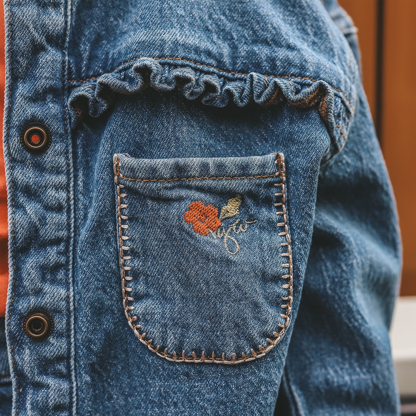 Het meisjes denim jasje is afgewerkt met drukknopen aan de voorzijde en een subtiel geborduurd bloemetje op het borstzakje. Deze verfijnde details geven het jasje een lieve en vrouwelijke uitstraling, terwijl de denim kwaliteit zorgt voor een stoere en tijdloze basis.