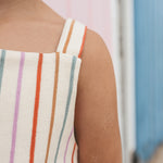 * Off-white basis met multicolor verticale strepen die zorgen voor een frisse, zomerse uitstraling en een speels kleuraccent.