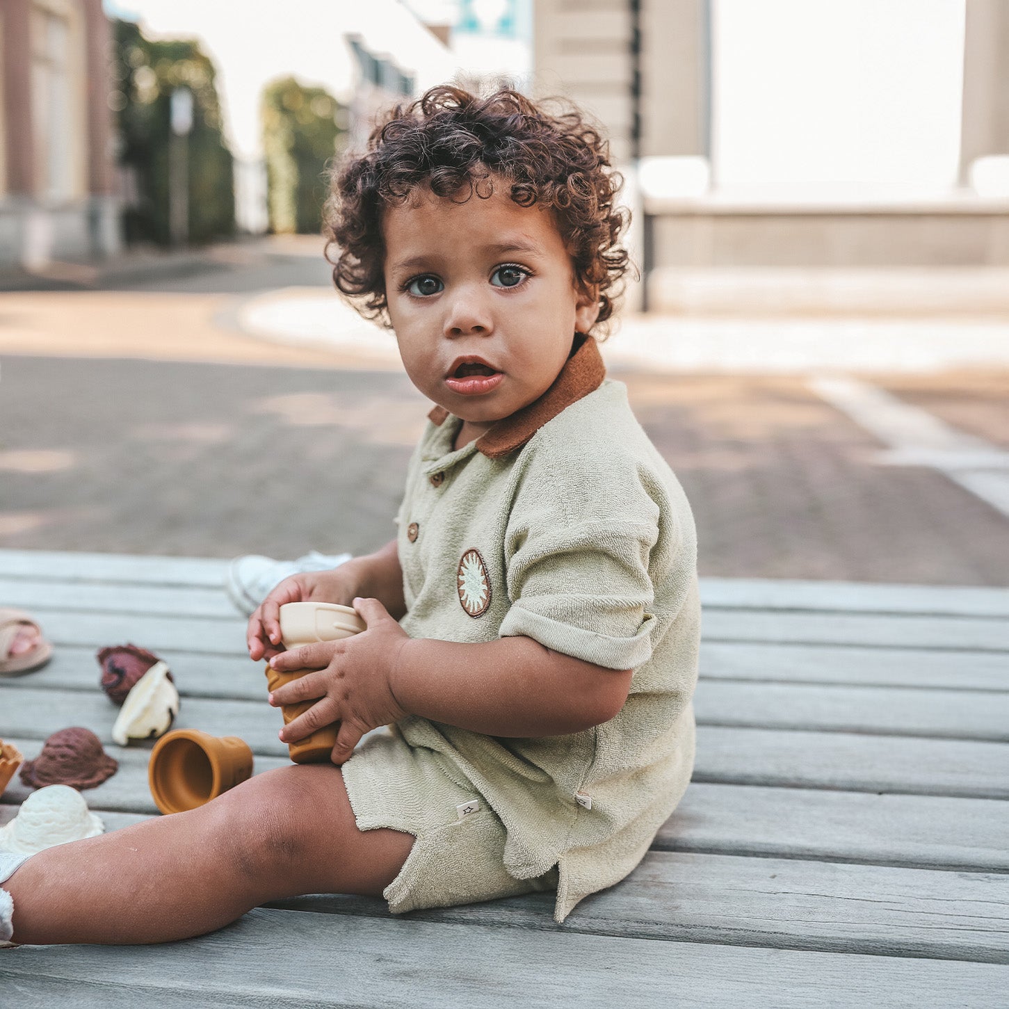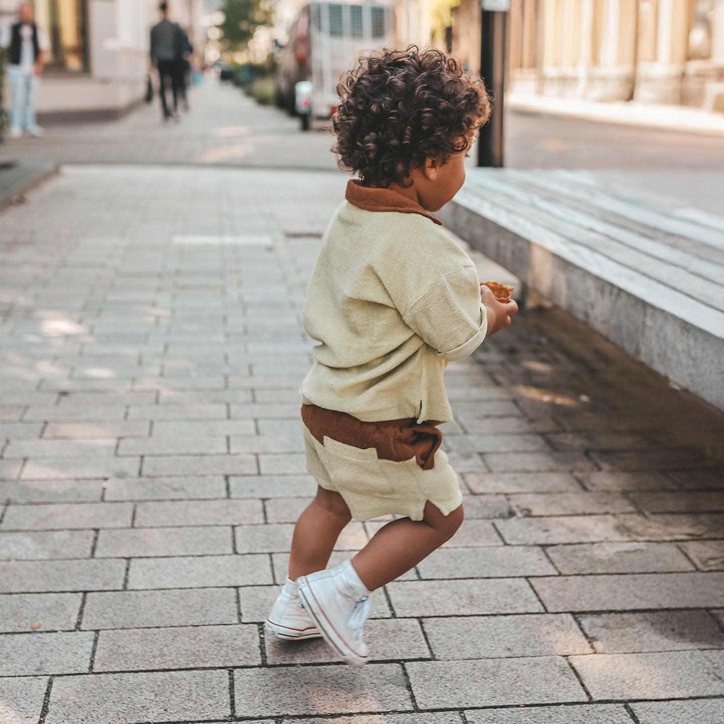 Dit kledingstuk is gemaakt van een comfortabele Terry-stof. Wees voorzichtig met oppervlakken die aan de lussen van deze stof kunnen blijven plakken, zoals klittenband. Zo blijft dit item het langste mooi :)