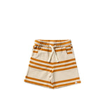 De Relaxed Short uit de Your Wishes Spring Summer 2026 collectie is een comfortabele bermuda voor jongens met een tijdloos streepdessin. De off-white basis wordt gecombineerd met warme okergele horizontale strepen voor een zomerse, maar rustige uitstraling.
