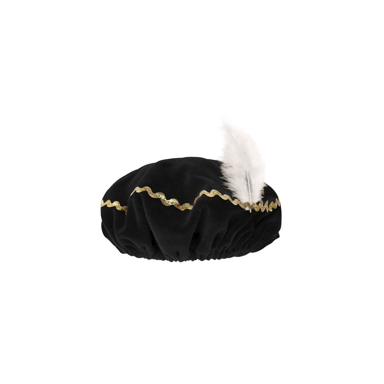 * Velvet pietenmutsje met elastieken band, gouden details en een wit veertje.