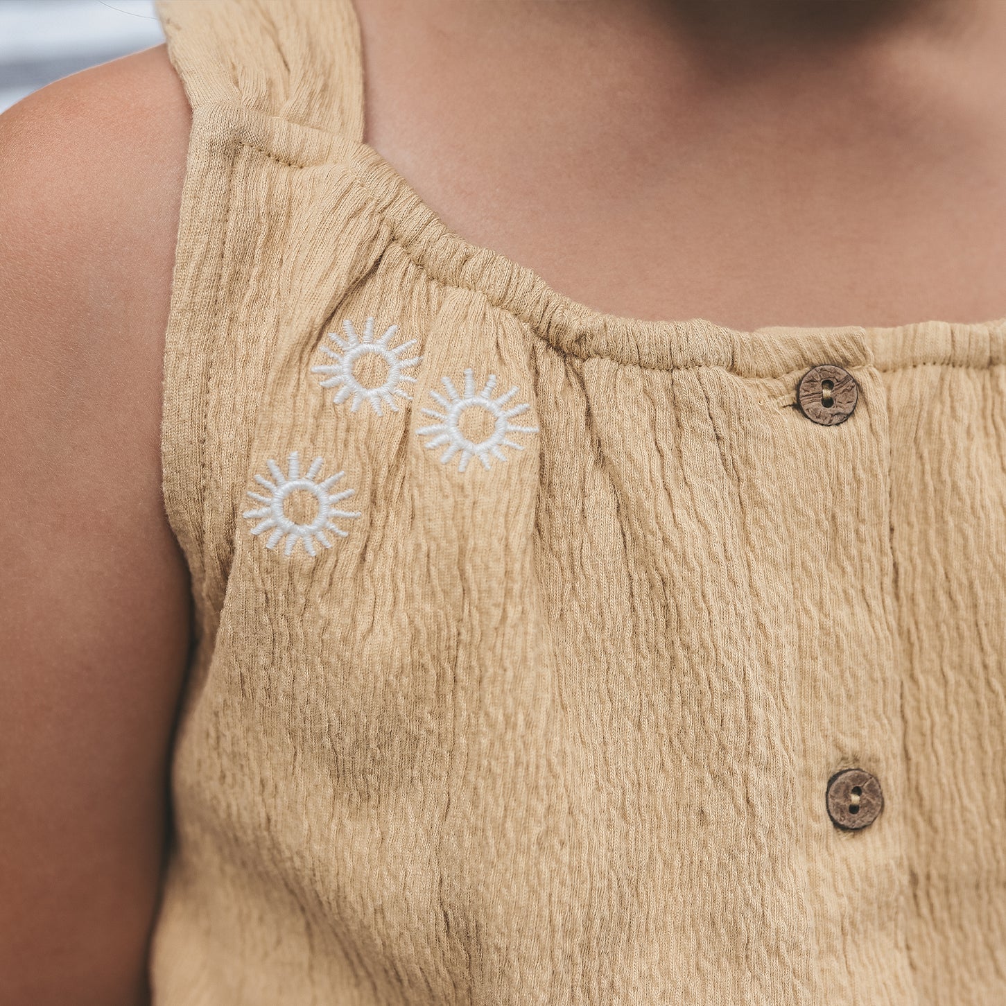 Langs de halslijn zijn kleine bloemenborduursels verwerkt die de top een lieve en speelse uitstraling geven. De meisjes top heeft verstelbare schouderbandjes en een knoopsluiting aan de voorzijde, wat zorgt voor een fijne pasvorm en een charmante afwerking.