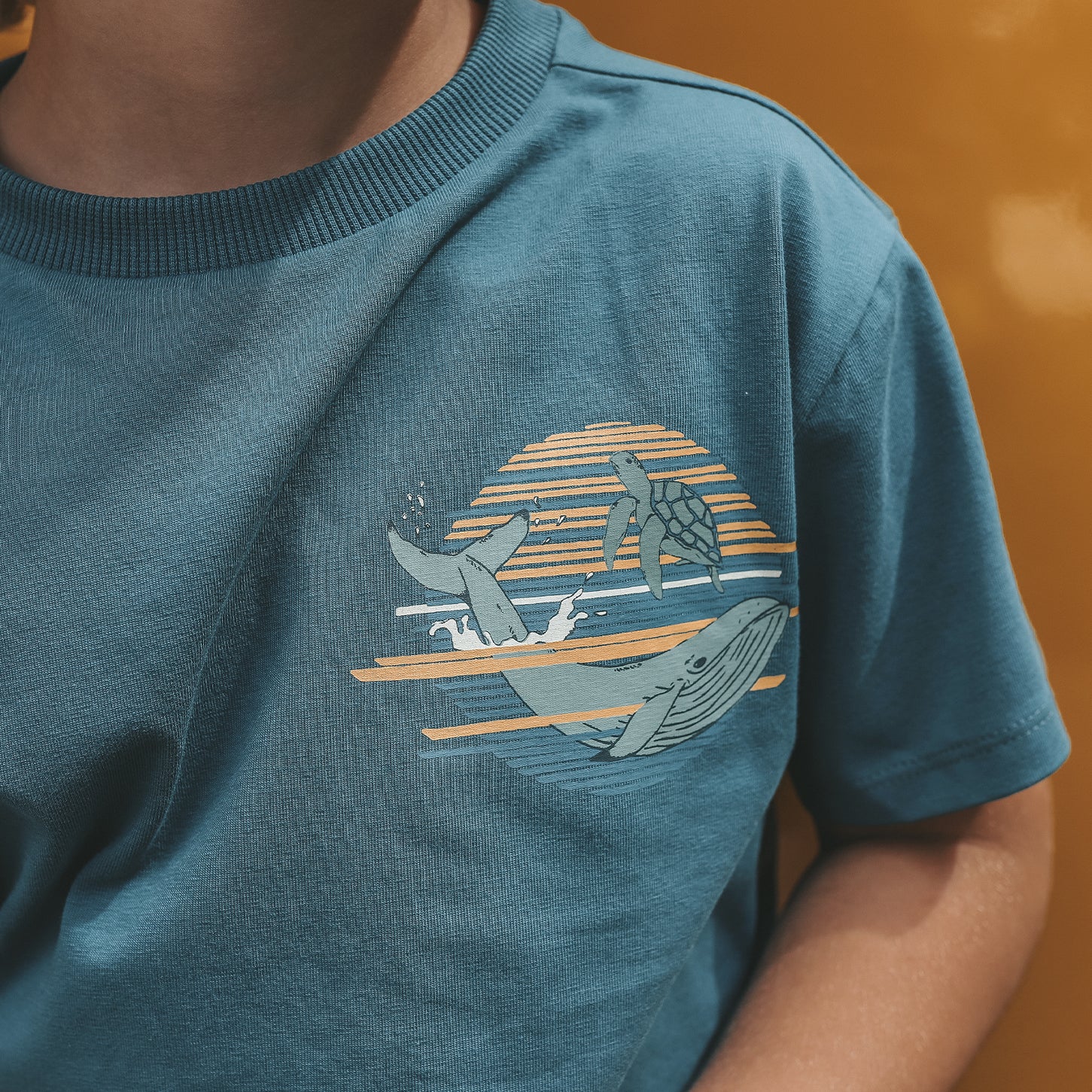 Op de borst bevindt zich een subtiele zomerse walvis print. De print in zachte, warme tinten zorgt voor een speels maar stijlvol contrast met de basis kleur. Dit jongens T-shirt is uitgevoerd in een zachte katoenkwaliteit die prettig aanvoelt op de huid en ideaal is voor warme lente- en zomerdagen. De relaxed fit biedt extra bewegingsvrijheid en geeft het shirt een nonchalante, moderne look.